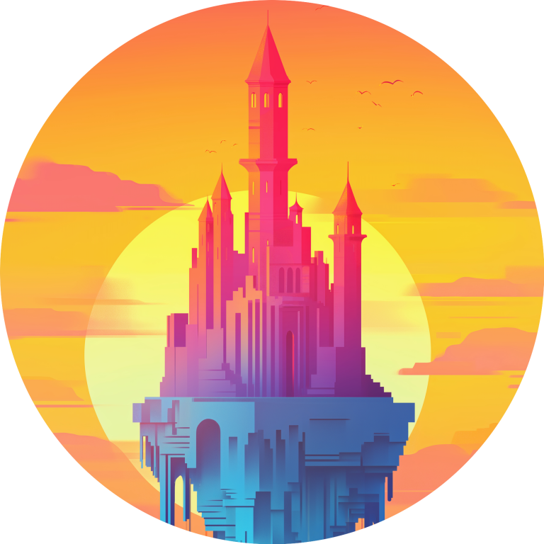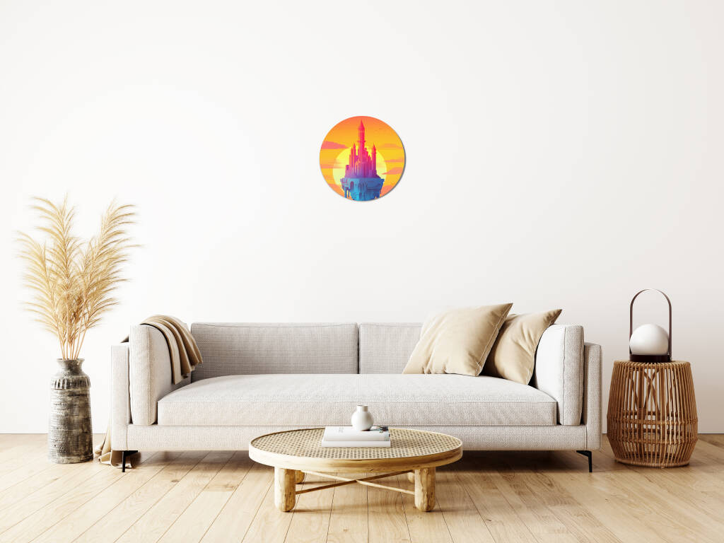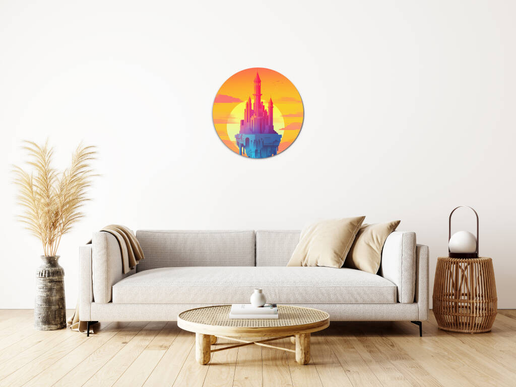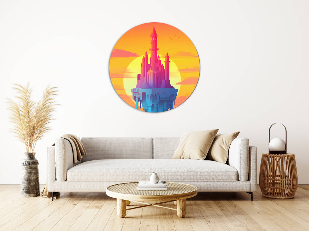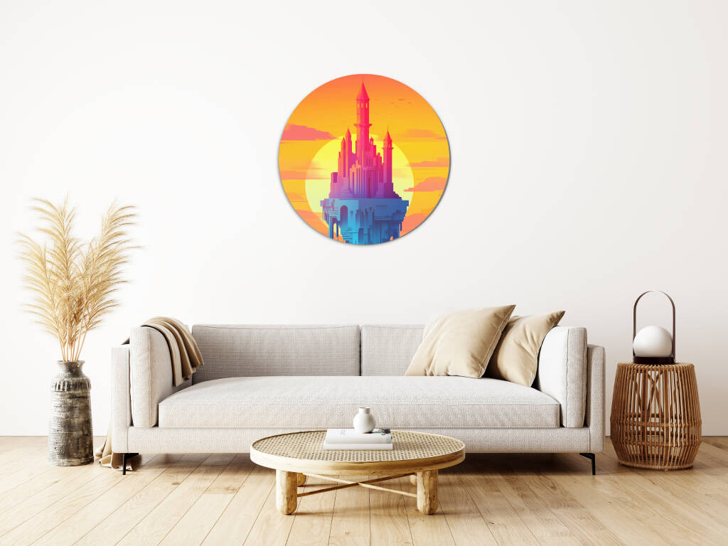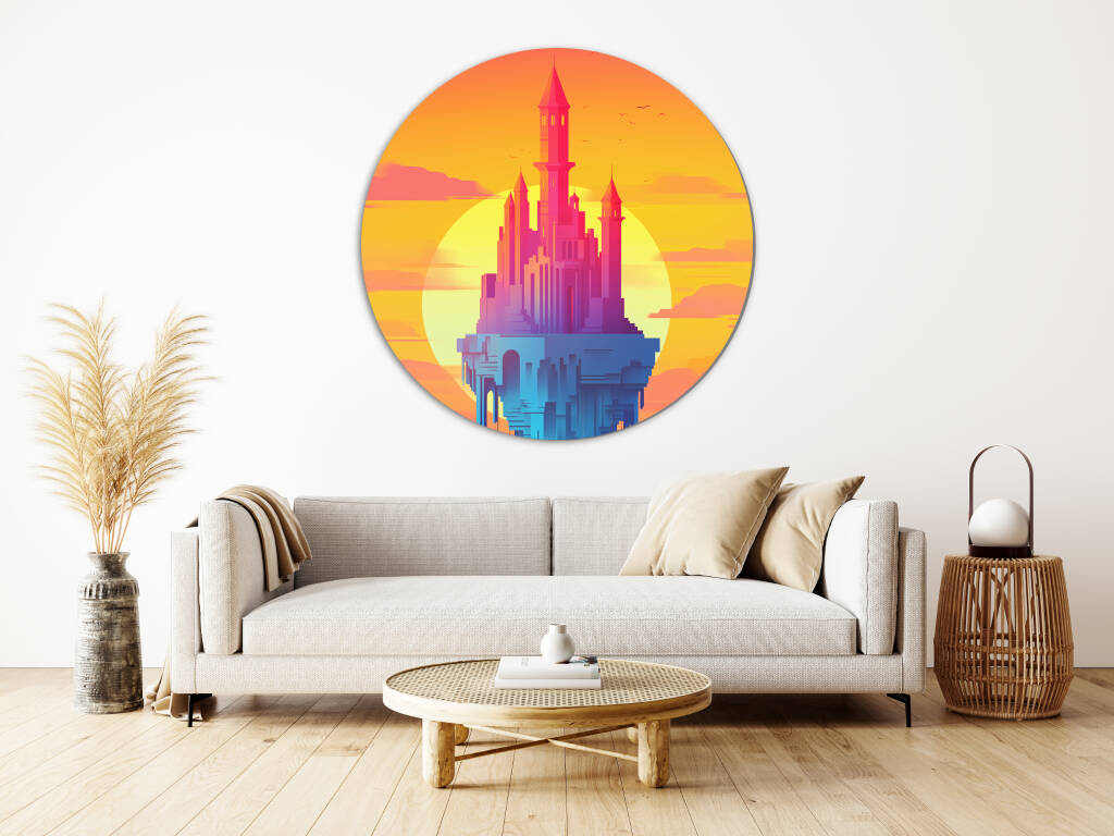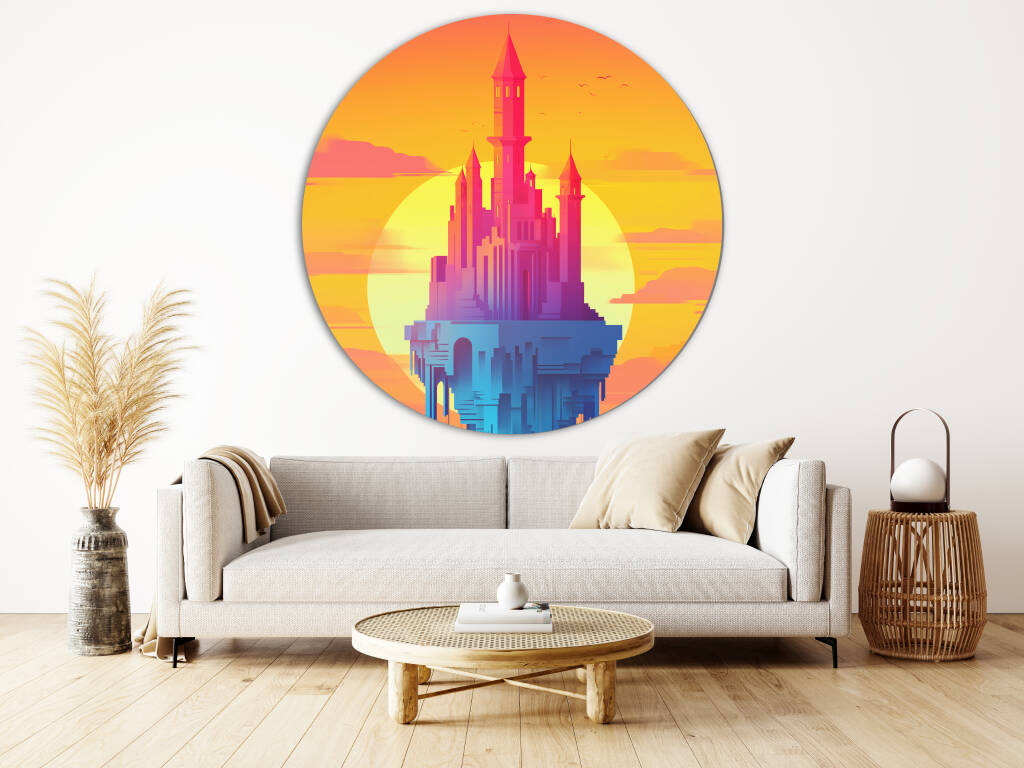 Castle in the Sky toont een magisch drijvend kasteel dat zweeft tussen de wolken in een fantasiewereld vol kleur en mystiek. Het imposante kasteel reflecteert in zijn eigen schaduw, waarbij de warme zonsondergangkleuren van oranje, roze en paars de hele scène in een dromerige gloed hullen. De silhouetten van bergen in de verte en de zachte wolkenformaties creëren een gevoel van oneindige vrijheid en avontuur. Dit betoverende kunstwerk brengt de magie van sprookjes direct in je leefruimte.