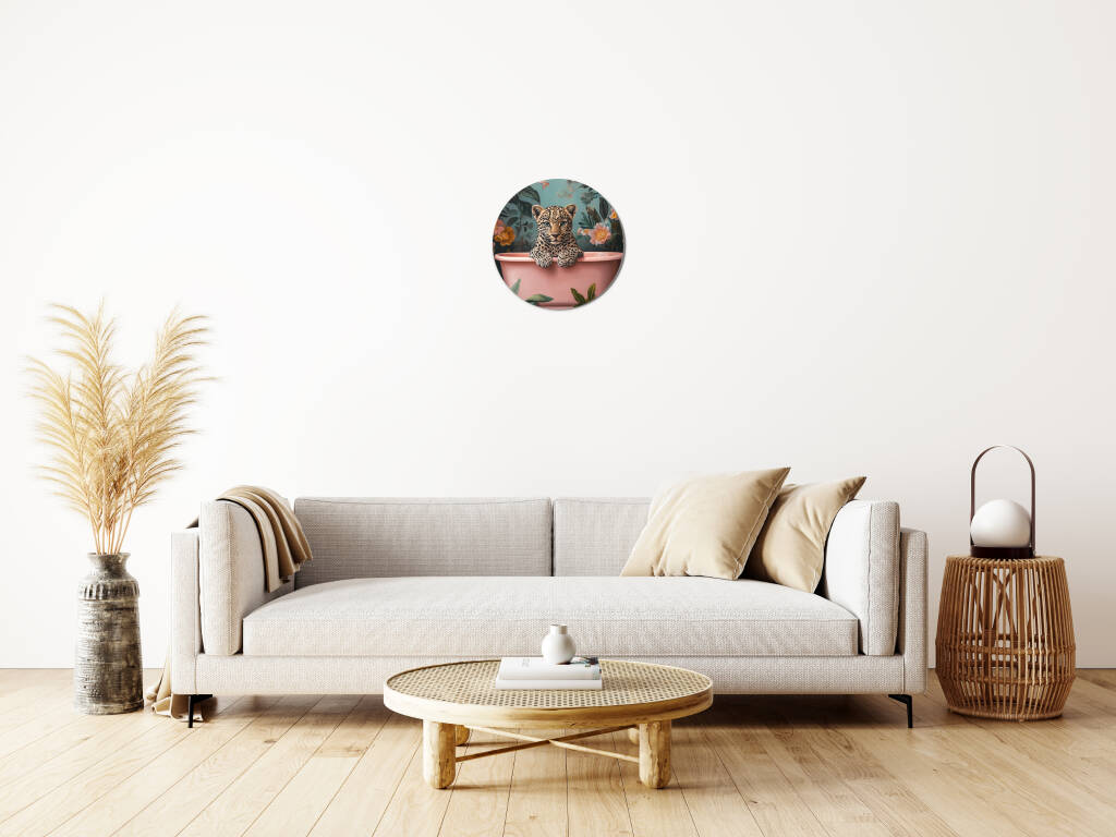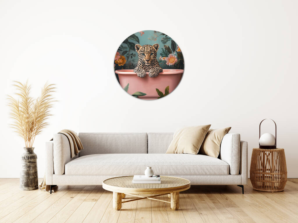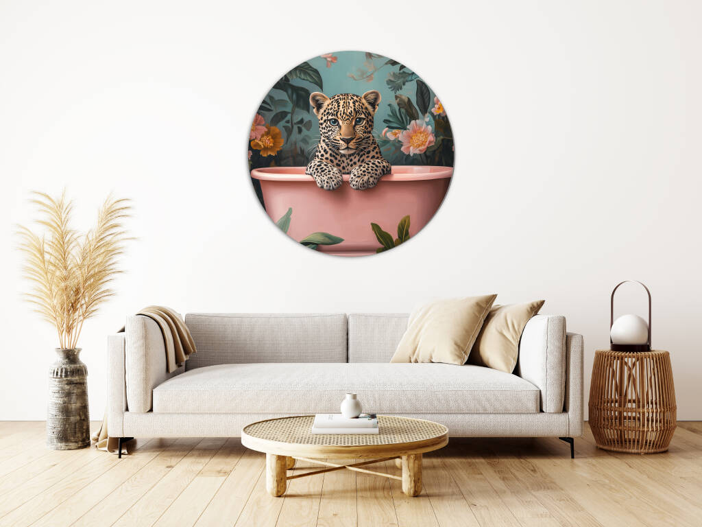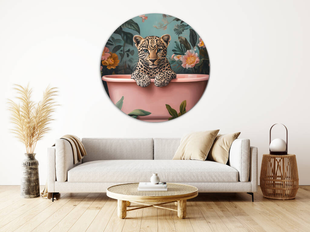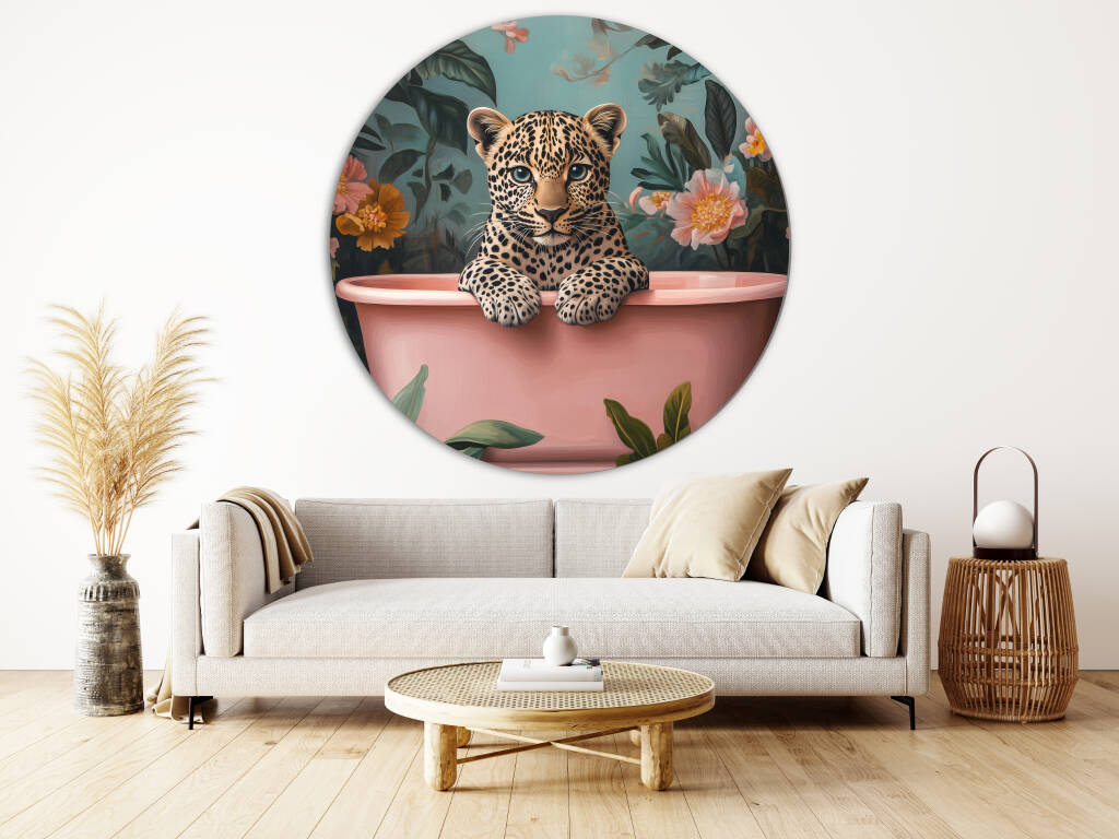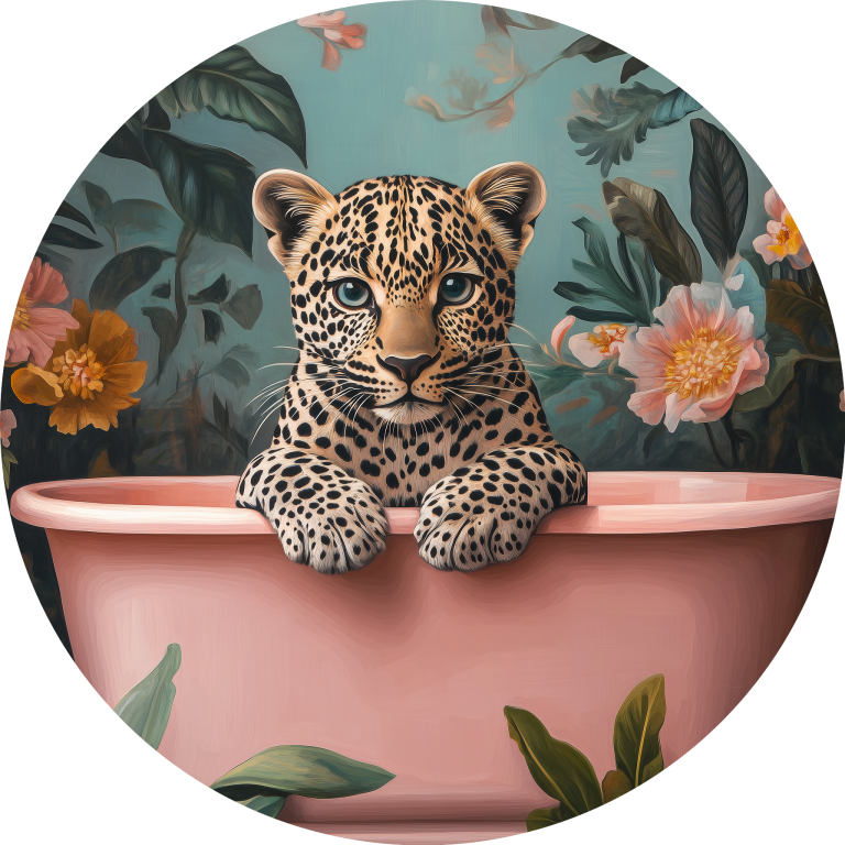 Een jonge luipaard zit nieuwsgierig in een roze badkuip te midden van een levendig, botanisch decor. De achtergrond is gevuld met weelderige bloemen in warme tinten van roze, geel en groen, die contrasteren met de turquoise muur. Het luipaard kijkt speels maar zelfverzekerd, wat een combinatie van charme en mysterie toevoegt aan het tafereel. De compositie straalt een mix van elegantie en speelse fantasie uit, waarbij het natuurlijke en het surrealistische op harmonieuze wijze samenkomen.