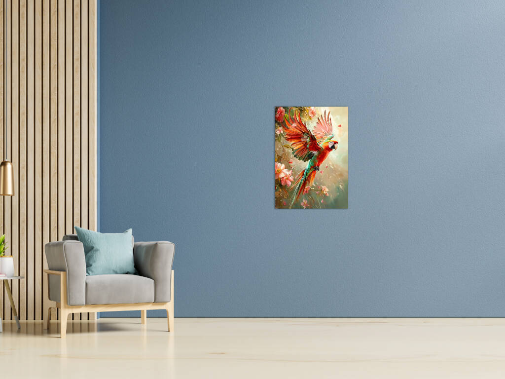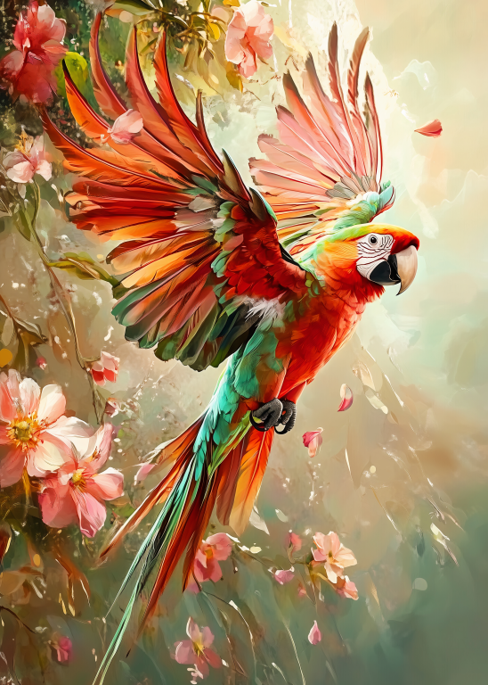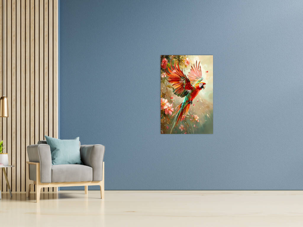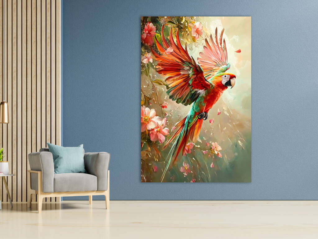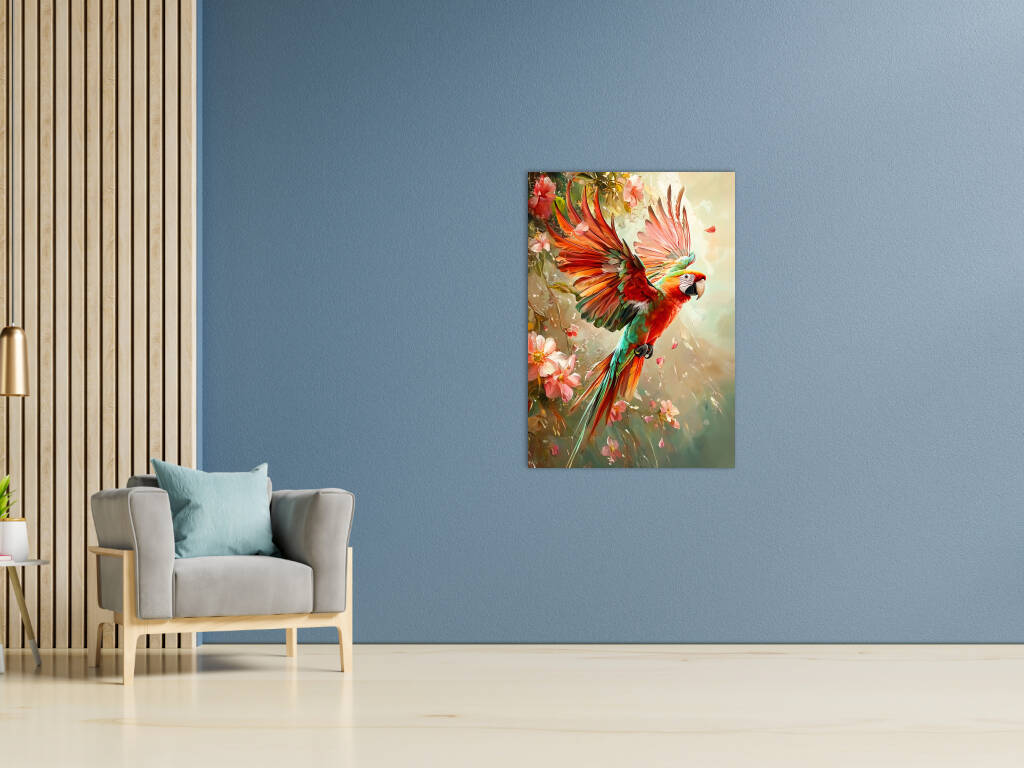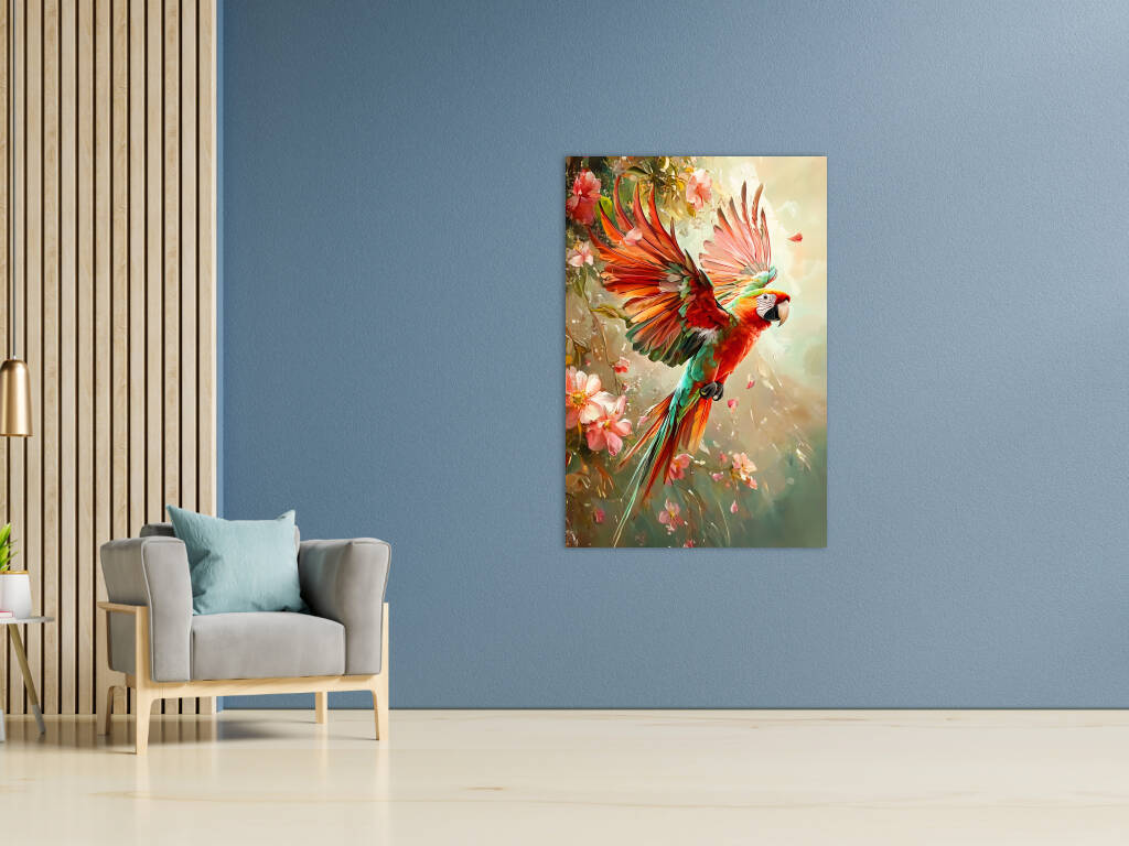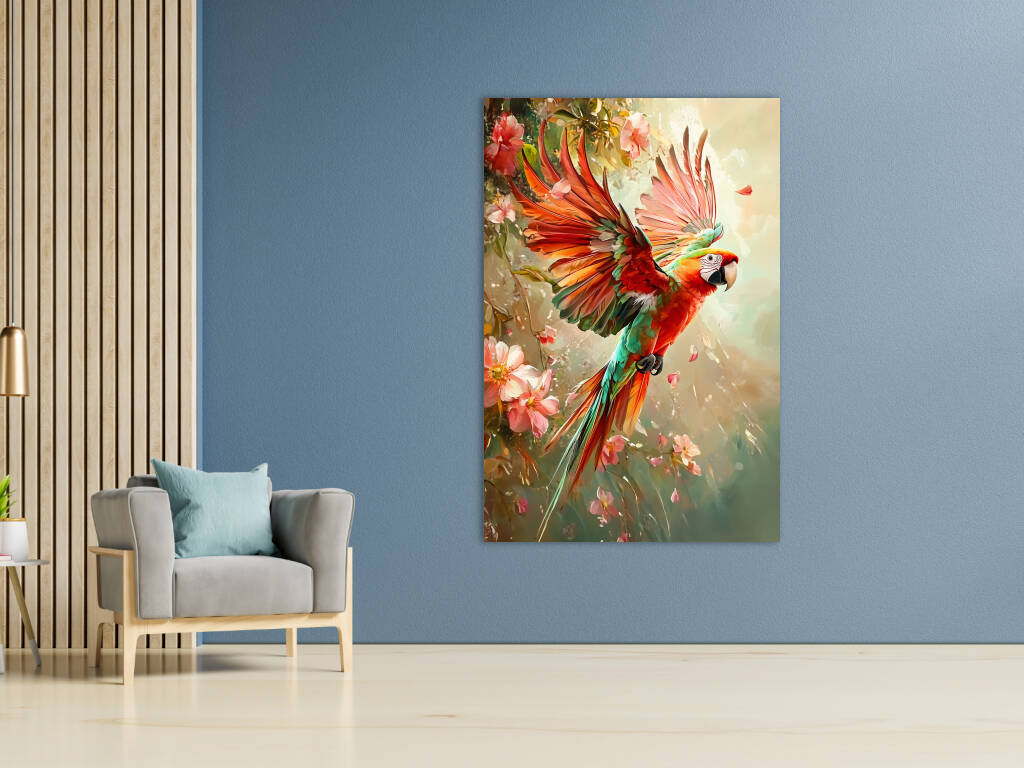 Macaw Parrot toont een majestueuze rode ara in volle vlucht, waarbij zijn schitterende veren worden omgeven door een explosie van delicate bloesemblaadjes. De levendige rood-oranje tinten van de papegaai contrasteren prachtig met de zachte roze bloemen die door de lucht dwarrelen, wat een gevoel van vreugde en vrijheid creërt. De dynamische compositie vangt het moment van pure gratie en kracht, terwijl de artistieke stijl zowel realisme als poëzie combineert. Dit betoverende kunstwerk brengt de exotische schoonheid van tropische natuur en de magie van de vlucht in je interieur.