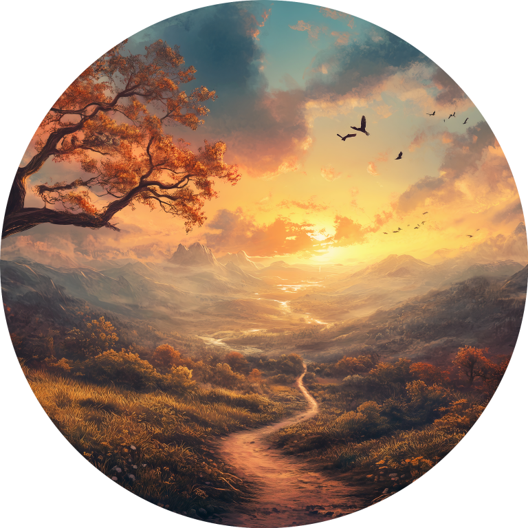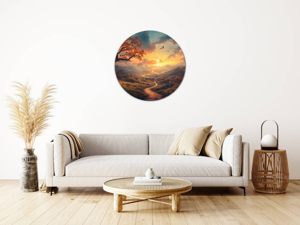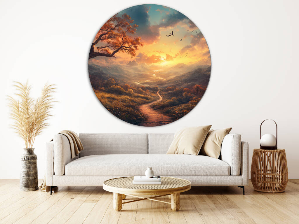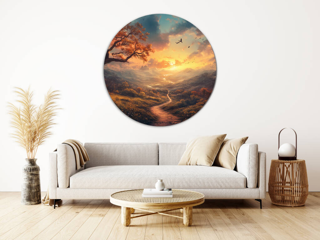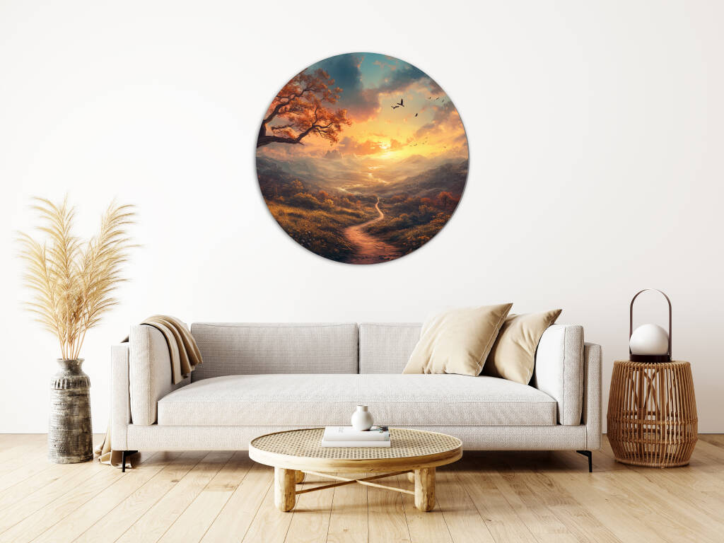 Dit schilderachtige kunstwerk neemt je mee op een magische reis door een glooiend landschap bij zonsondergang. Een kronkelend pad leidt je door een idyllische vallei, omringd door kleurrijke bomen en een warme gloed van de ondergaande zon. De sfeer ademt rust, avontuur en een vleugje mysterie, perfect voor liefhebbers van natuurlijke schoonheid. Ideaal om een gevoel van ruimte en sereniteit toe te voegen aan je interieur, of het nu een woonkamer, kantoor of slaapkamer betreft. Een betoverend statement voor elke wand.