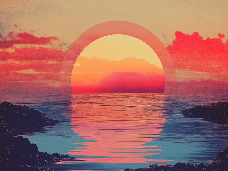 LoFi Sunset baadt je in de warme gloed van een dromerige zonsondergang in retro-stijl. De gestileerde zon, opgebouwd uit concentrische cirkels in gradaties van geel tot dieprood, zinkt langzaam achter de horizon. Het water weerspiegelt de kleuren van de hemel in zachte rimpelingen, terwijl donkere rotsformaties het tafereel omlijsten. Dit kunstwerk haalt inspiratie uit de lo-fi esthetiek en vaporwave cultuur, waarbij nostalgie en escapisme samenkomen. De verzadigde kleuren en grafische vormen creëren een gevoel van rust en contemplatie, als een visuele soundtrack voor ontspanning. Perfect voor het creëren van een zen-achtige sfeer die doet verlangen naar eindeloze zomeravonden aan de kust.