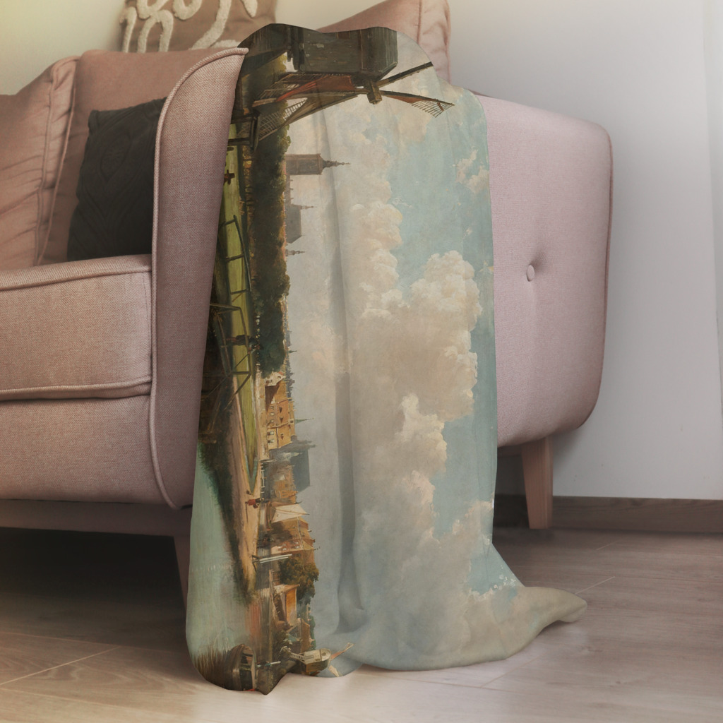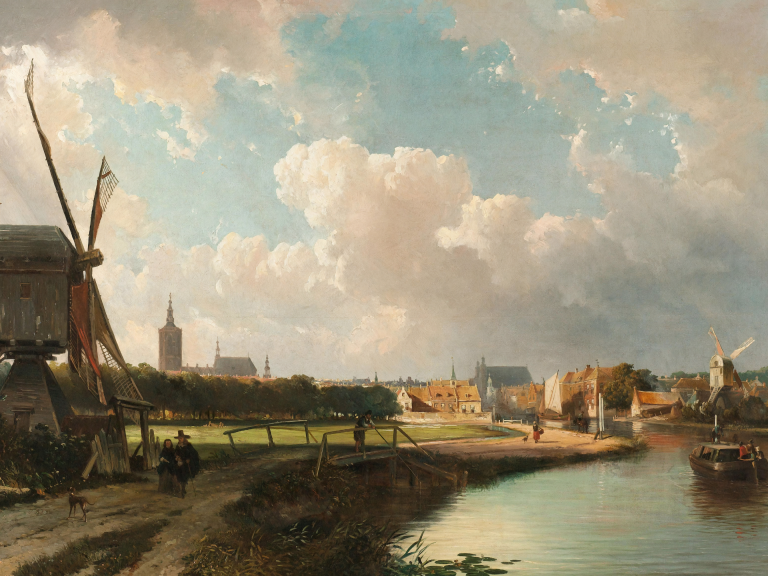 Zicht op Den Haag vanaf de Delftse Vaart toont een karakteristiek Nederlands landschap uit de Gouden Eeuw. De monumentale windmolens langs de waterweg vormen een iconisch silhouet tegen de bewolkte Hollandse lucht. In de verte zijn de torens van Den Haag zichtbaar, terwijl een trekschuit kalm over het water glijdt. Het spel van licht en schaduw op de wolken geeft dit historische tafereel een tijdloze schoonheid. De warme, gouden tinten van het zonlicht contrasteren prachtig met de koele blauwtinten van de lucht. Dit werk vangt de essentie van het Nederlandse landschap en de belangrijke rol die waterwegen speelden in het dagelijks leven en transport tussen steden. Een nostalgisch venster naar het verleden dat de grootsheid van ons cultureel erfgoed viert.