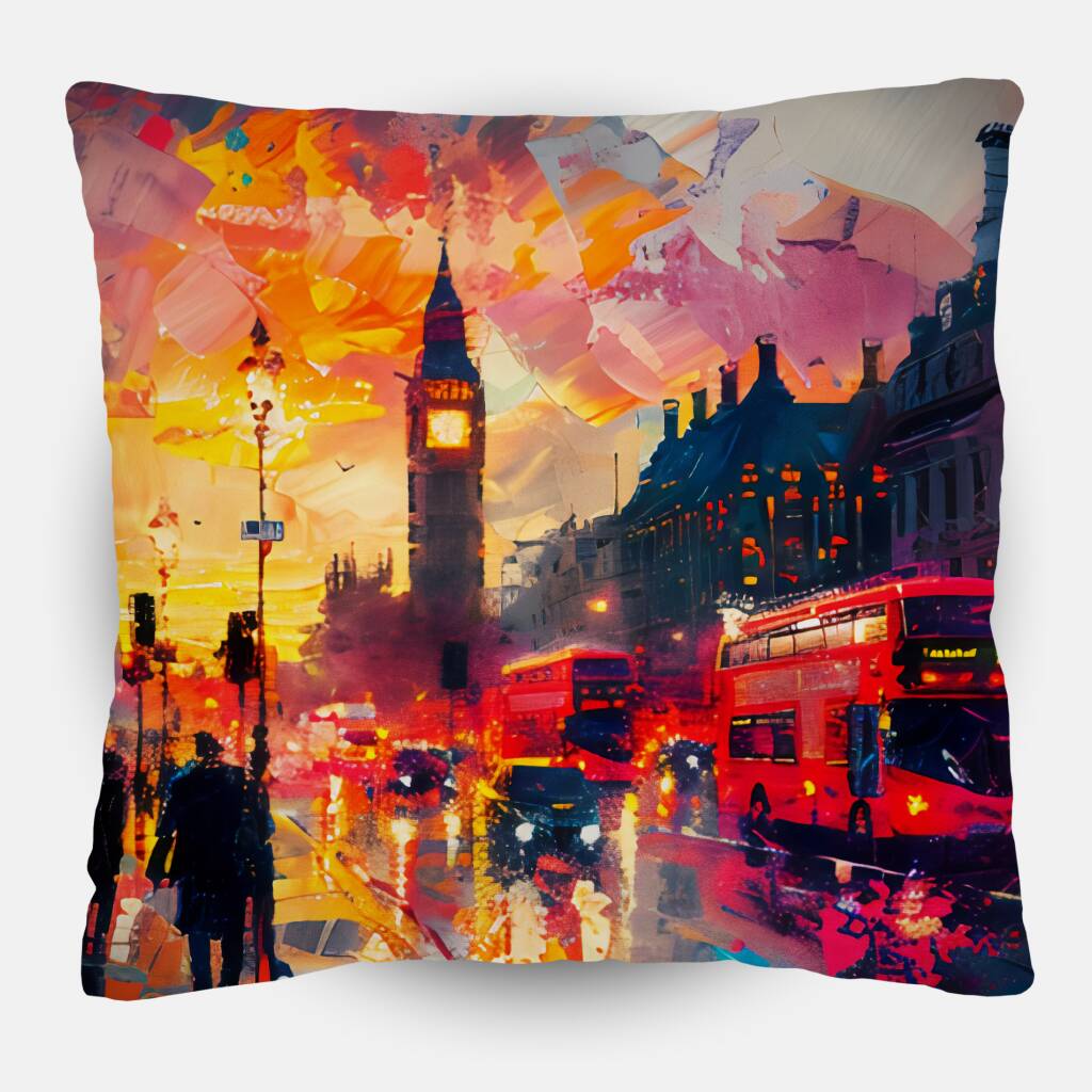 Mornin' London is een levendige, impressionistische weergave van de Londense ochtendspits, waarin een drukke straat tot leven komt met de iconische Big Ben prominent op de achtergrond, badend in een warme zonsopgang. De lucht is een dynamische mix van roze, oranje en blauwe tinten, wat het gevoel van een nieuwe dag perfect weergeeft, terwijl de natgeregende straten de felle lichten van rode dubbeldekkers, autolampen en de gloed van winkelverlichting reflecteren. Donkere silhouetten van voetgangers bewegen haastig door de straat, wat de gejaagde sfeer van de ochtend benadrukt. De grove maar expressieve penseelstreken geven de scène een energieke, bijna tastbare dynamiek, waardoor de bruisende, ontwakende sfeer van Londen krachtig wordt vastgelegd.