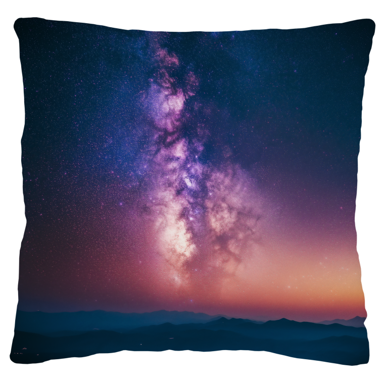Milky Way toont een adembenemend nachtlandschap waarin de galactische kern van onze melkweg zich in al zijn pracht ontvouwt boven een serene bergenreeks. De warme paarse en roze tinten van de sterrennevels contrasteren prachtig met het koele blauw van de schemering, terwijl miljoenen sterren als diamanten fonkelen in de kosmische dans. De vredige aardse landschap vormt een perfecte tegenhanger tot de grandeur van het universum erboven. Dit inspirerende kunstwerk brengt de oneindige schoonheid van de kosmos en ons plaats daarin direct in je leefruimte.
