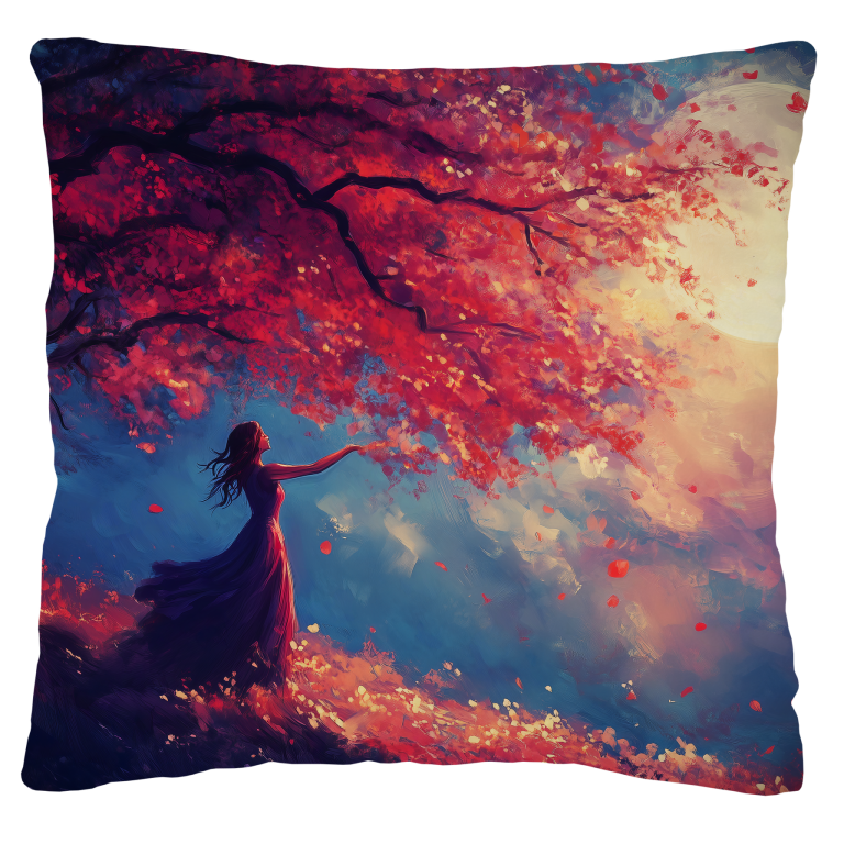 Een dromerige, magische scène waarin een vrouw in een vloeiende paarse jurk onder een prachtige boom met rode bloesems staat. De takken van de boom reiken naar een grote, gloeiende volle maan die de lucht in warme, zachte tinten verlicht. De achtergrond heeft een mix van blauwe en paarse tinten, wat een sprookjesachtige sfeer creëert. De vallende bloesemblaadjes en het mysterieuze lichtspel maken dit kunstwerk betoverend en romantisch.