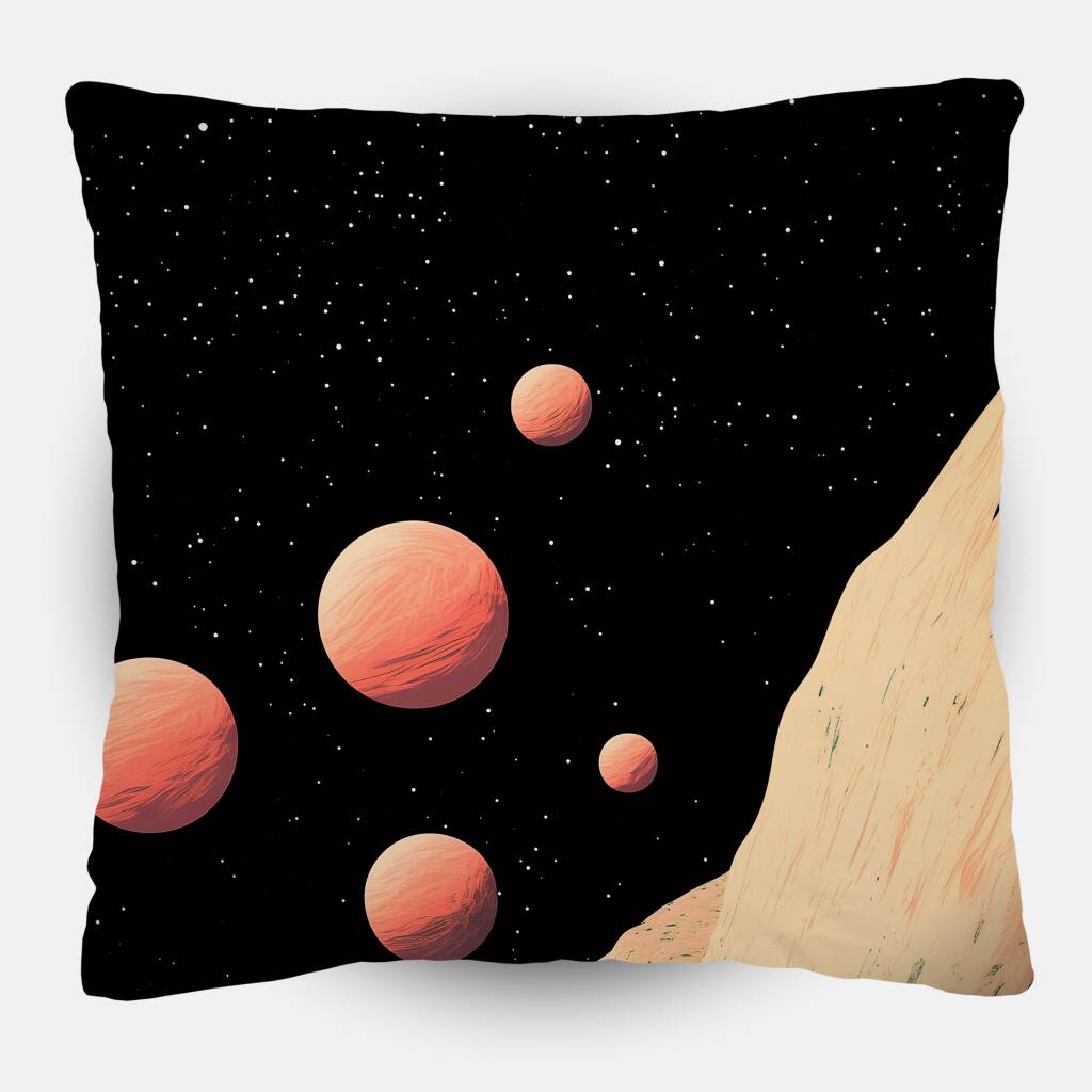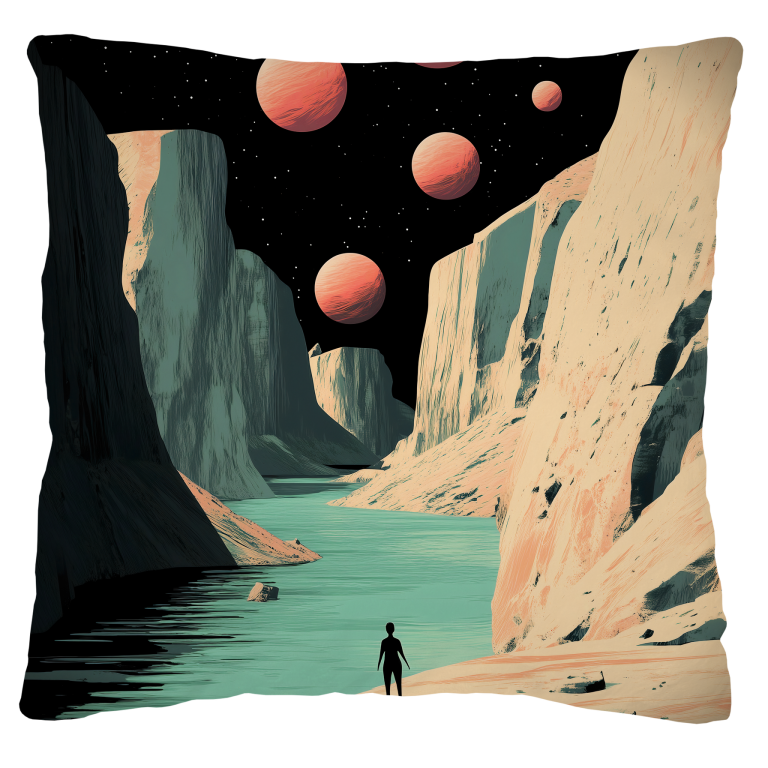 Far Far Away toont een eenzame reiziger die staat aan de oever van een turquoise meer op een vreemde planeet, omgeven door imposante rotsformaties en een hemel vol roze planeten. De contrast tussen de warme beige rotsen en het koele water creëert een serene maar mysterieuze sfeer, terwijl de sci-fi elementen een gevoel van avontuur en ontdekking oproepen. De minimalistische compositie en de zachte kleuren geven dit kunstwerk een meditatieve kwaliteit. Dit inspirerende ruimtelandschap nodigt uit om te dromen over verre werelden en oneindige mogelijkheden.