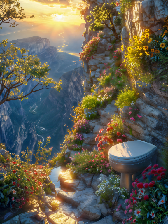 S(h)itting with a View is een humoristisch maar adembenemend kunstwerk dat een eenzame WC troont op de rand van een majestueus berglandschap. Omringd door weelderige bloemen en zonovergoten rotsen, biedt deze unieke troon een ongeƫvenaard uitzicht op een diep dal en een spectaculaire zonsondergang. De combinatie van de serene natuur en de onverwachte aanwezigheid van het toilet creƫert een speelse balans tussen verwondering en hilariteit, waardoor dit kunstwerk zowel rustgevend als geestig aanvoelt.