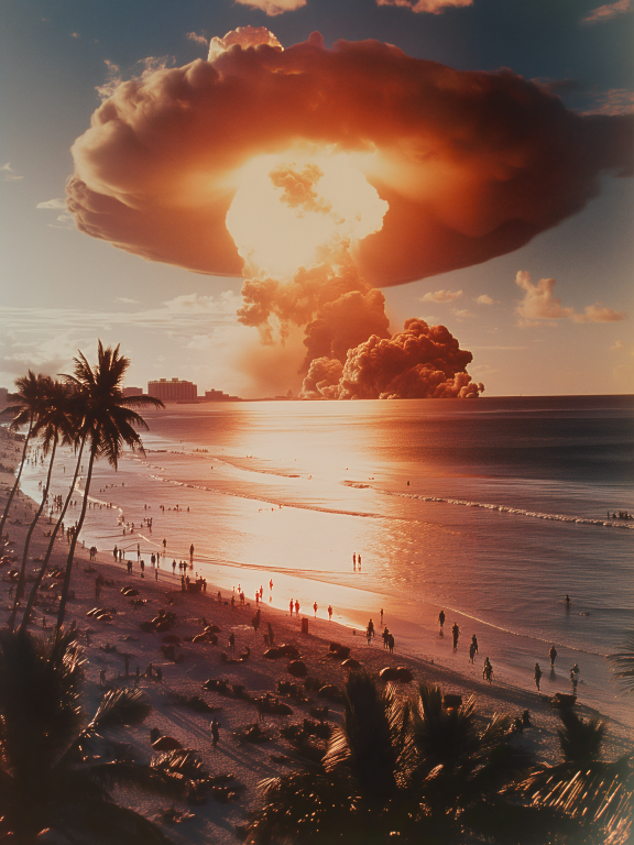 Een opvallende en dramatische scène waarin een serene strandomgeving contrasteert met een immense paddenstoelwolk in de verte. De gouden gloed van de zonsondergang vermengt zich met de vurige oranje tinten van de explosie, terwijl silhouetten van palmbomen en strandgangers een gevoel van alledaagse rust oproepen. De overweldigende wolk symboliseert zowel destructie als kracht, terwijl de rust van de kustlijn een surrealistisch contrast biedt. Het werk speelt met thema’s als natuur, menselijkheid en de kwetsbaarheid van het bestaan, vastgelegd in een adembenemend schouwspel.