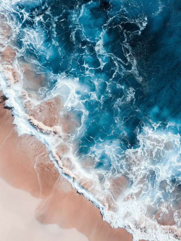 Een luchtbeeld van een prachtige kustlijn waar turquoise golven krachtig botsen tegen een zandstrand. De overgang tussen het diepblauwe water en het zachte beige strand creƫert een betoverend kleurenspel. De schuimpatronen van de golven voegen een dynamische textuur toe, alsof de natuur zelf dit werk heeft gemaakt. Deze compositie vangt zowel de serene schoonheid als de krachtige energie van de oceaan en vormt een perfecte visuele interpretatie van de eeuwige interactie tussen land en zee.