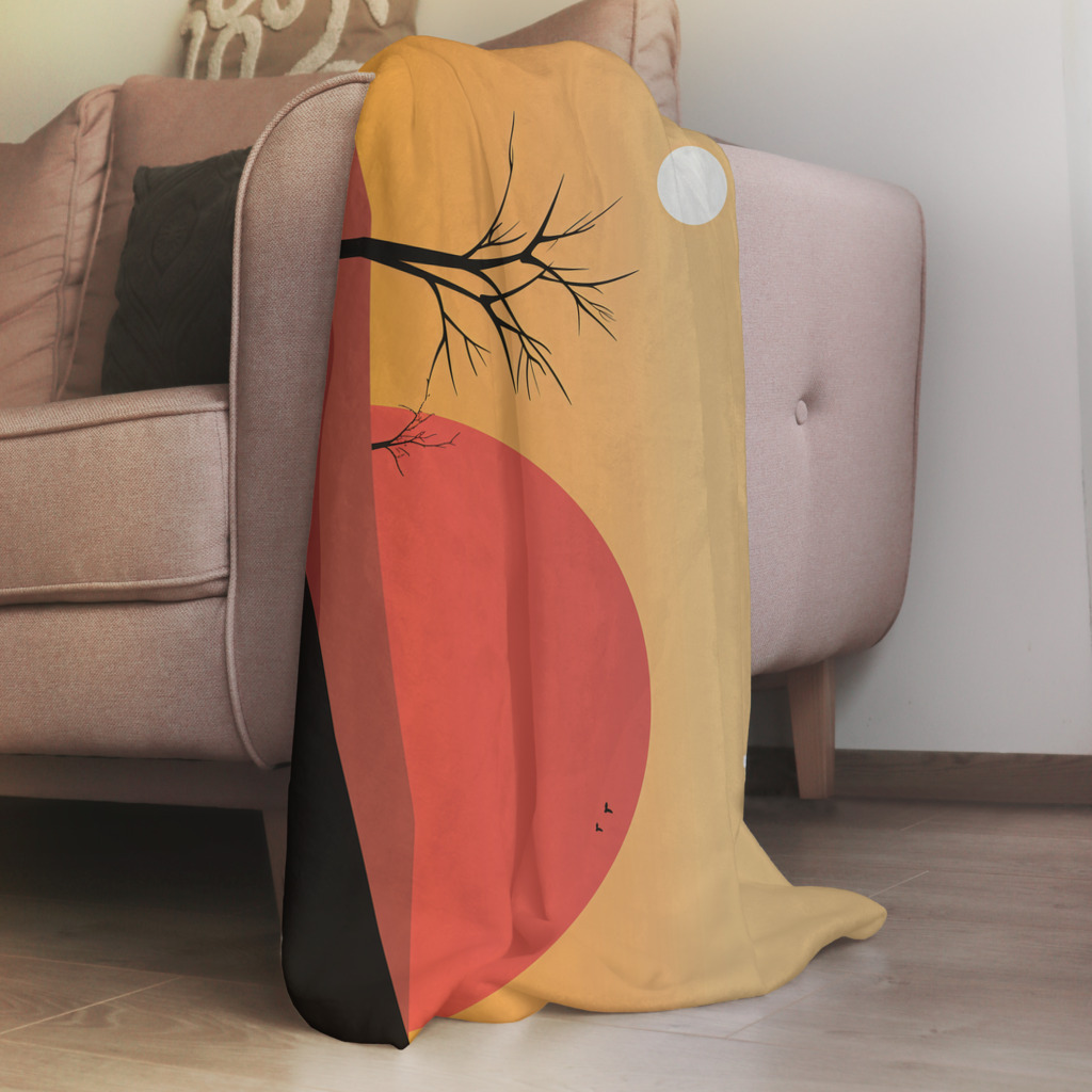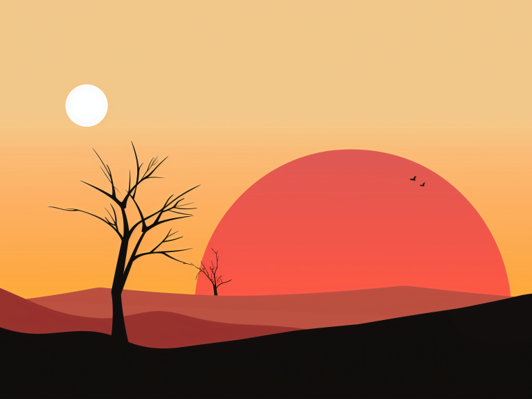 Een minimalistisch en sfeervol kunstwerk dat een serene woestijnlandschap weergeeft bij zonsondergang. De lucht baadt in warme tinten van oranje en geel, terwijl de grote rode zon langzaam achter de glooiende heuvels zakt. Twee kale bomen met hun gestileerde silhouetten geven het geheel een gevoel van rust en symmetrie, terwijl twee vogels vredig door de lucht zweven. De eenvoud en harmonie in dit werk creƫren een meditatieve sfeer en geven een gevoel van balans tussen natuur en stilte.