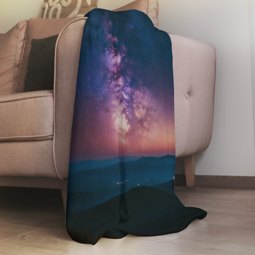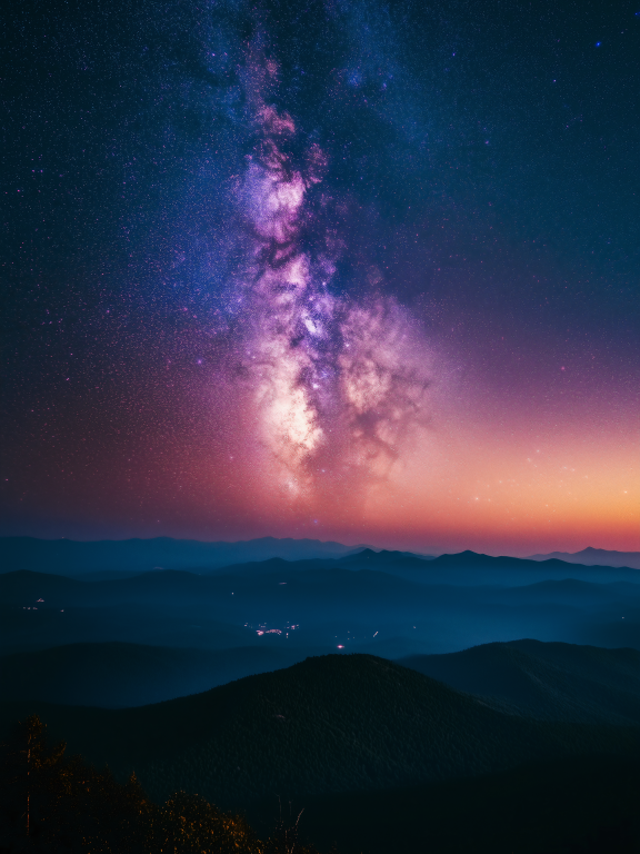Milky Way toont een adembenemend nachtlandschap waarin de galactische kern van onze melkweg zich in al zijn pracht ontvouwt boven een serene bergenreeks. De warme paarse en roze tinten van de sterrennevels contrasteren prachtig met het koele blauw van de schemering, terwijl miljoenen sterren als diamanten fonkelen in de kosmische dans. De vredige aardse landschap vormt een perfecte tegenhanger tot de grandeur van het universum erboven. Dit inspirerende kunstwerk brengt de oneindige schoonheid van de kosmos en ons plaats daarin direct in je leefruimte.