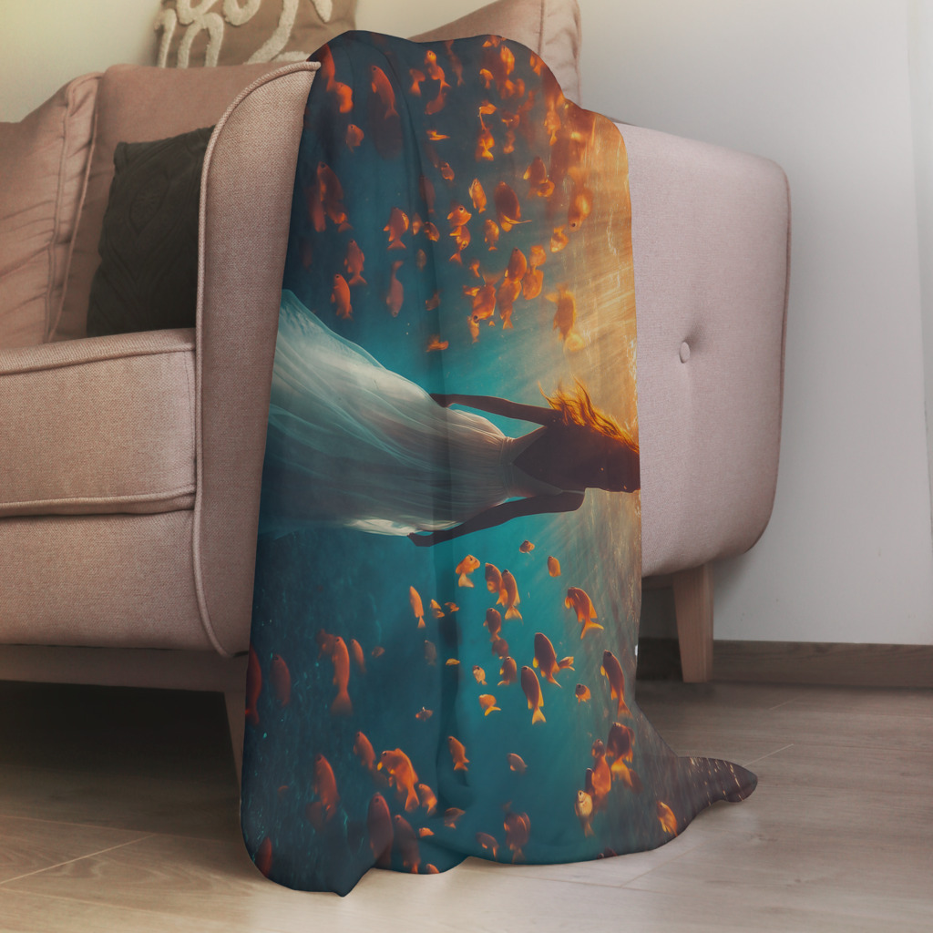 Underwater Walk toont een magische onderwaterscène waarin een elegante vrouw in een wijduitlopende jurk sereen wandelt door de diepten van de oceaan. Gouden zonnestralen doordringen het turquoise water en verlichten een school van oranje tropische vissen die graceus om haar heen zwemmen. De surrealistische scène creëert een dromerige atmosfeer waarin de grenzen tussen realiteit en fantasie vervagen. Dit betoverende kunstwerk symboliseert vrede, gratie en de harmonie tussen mens en natuur in een wereld vol wonderen.