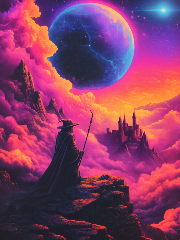 Neon Wizard opent een poort naar een magische wereld waar een mysterieuze tovenaar waakt over een kosmisch landschap. De neon-kleuren van roze, paars en oranje creƫren een hypnotiserende atmosfeer, terwijl een gigantische planeet dreigend boven het fantasielandschap hangt. Het kasteel in de verte belooft verhalen van oude magie en avontuur. Dit betoverende kunstwerk brengt de wonderen van science fiction en fantasy samen in een spectaculair visueel feest voor elke ruimte.