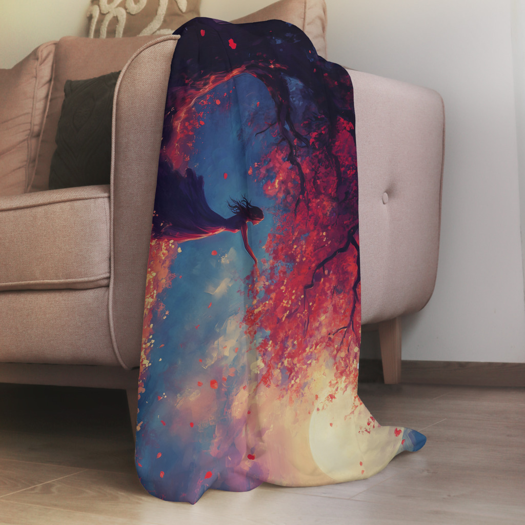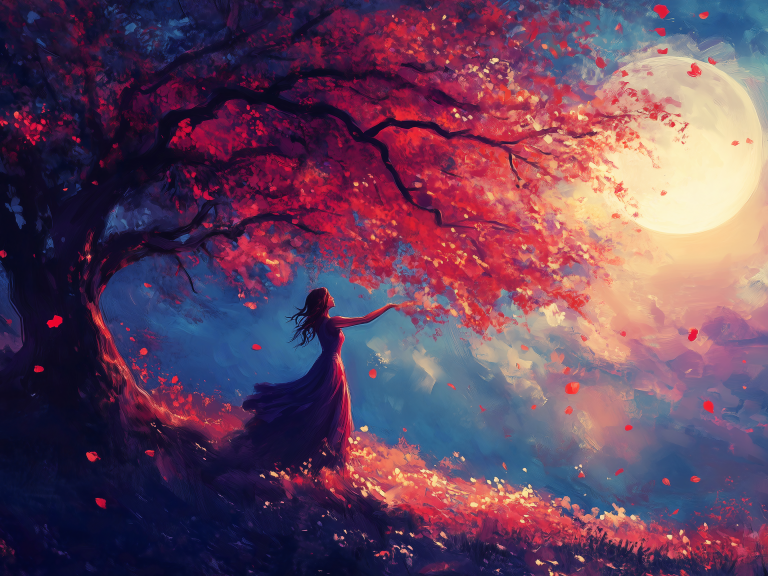 Een dromerige, magische scène waarin een vrouw in een vloeiende paarse jurk onder een prachtige boom met rode bloesems staat. De takken van de boom reiken naar een grote, gloeiende volle maan die de lucht in warme, zachte tinten verlicht. De achtergrond heeft een mix van blauwe en paarse tinten, wat een sprookjesachtige sfeer creëert. De vallende bloesemblaadjes en het mysterieuze lichtspel maken dit kunstwerk betoverend en romantisch.