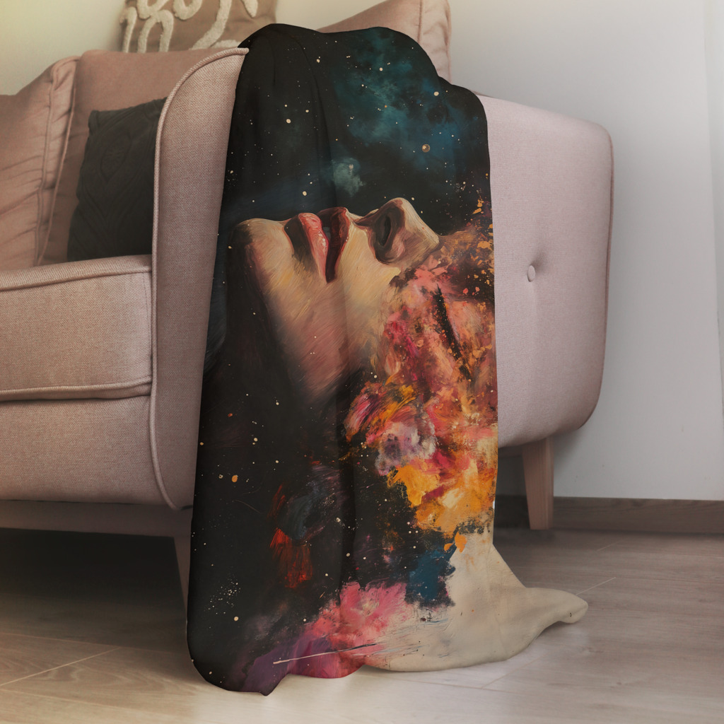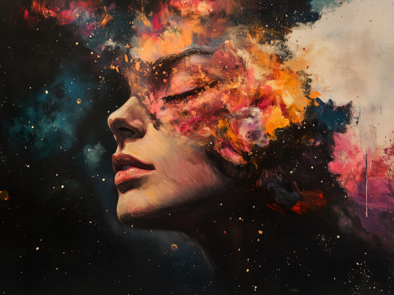 Face Nebula presenteert een mystieke fusie waarbij een vrouwelijk profiel wordt omgeven door kosmische explosies van oranje en rode sterrennevels. Het serene gezicht contrasteert prachtig met de turbulente energie van de ruimte, waarbij sterren als diamanten fonkelen in het donkere universum. De warme kleuren van de nevel lijken uit het haar van de figuur te strömen, wat een gevoel van kosmische verbondenheid en transcendentie creëert. Dit spirituele kunstwerk nodigt uit tot contemplatie over onze plaats in het universum.