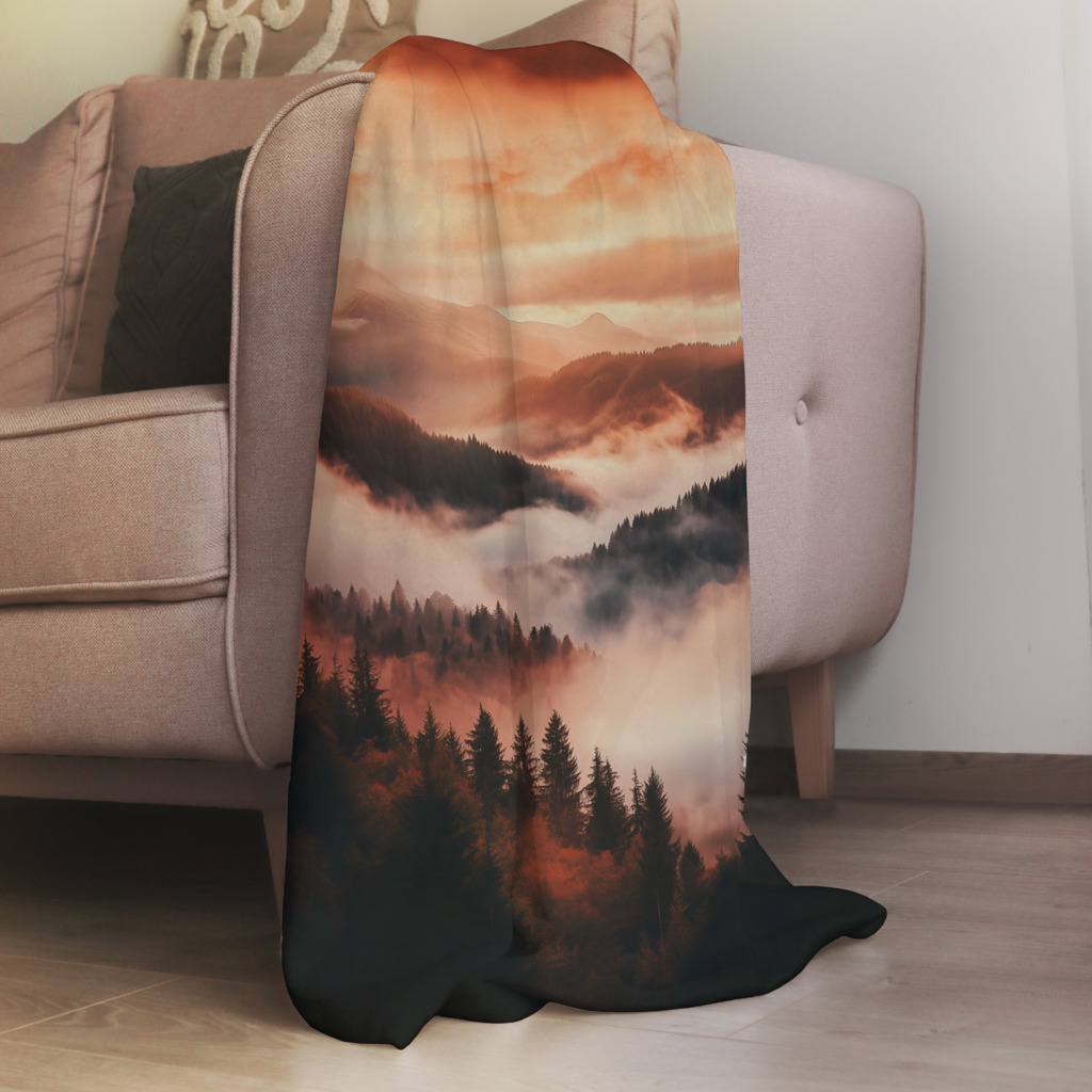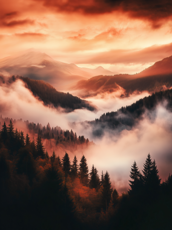 Misty Mountain onthult een adembenemend berglandschap gehuld in mysterieuze nevels en het warme licht van de gouden uurtjes. De dramatische oranje hemel contrasteert prachtig met de zachte mistsluiers die door de valleien dansen, terwijl donkere dennenbomen als wachters op de voorgrond staan. Dit sfeervolle landschap straalt rust en grootsheid uit, een ode aan de ongetemde schoonheid van de natuur. Perfect voor wie verlangt naar de sereniteit van berglandschappen en de magie van het gouden uur.