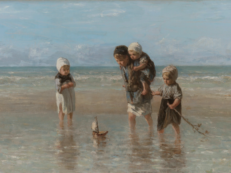 Kinderen der zee vangt een ontroerend moment van kinderlijke onschuld aan het strand. Visserskinderen in traditionele klederdracht spelen met een zelfgemaakt bootje in de branding, terwijl de zee haar eeuwige lied zingt. Het gedempte kleurenpalet van zachtblauwe en grijze tinten weerspiegelt de sfeer van een bewolkte dag aan de Nederlandse kust. Dit werk documenteert niet alleen het harde leven van vissersgezinnen, maar toont ook de veerkracht en vreugde die kinderen vinden in de eenvoudigste dingen. De kunstenaar heeft met grote gevoeligheid de tederheid vastgelegd waarmee de kinderen voor elkaar zorgen. Een tijdloos portret van jeugd aan zee dat universele themas van spel, zorg en gemeenschap verkent.