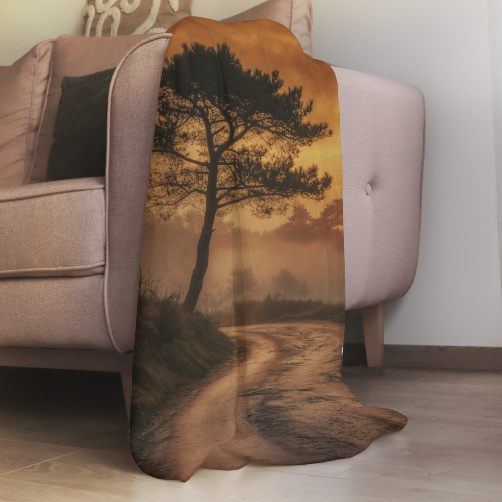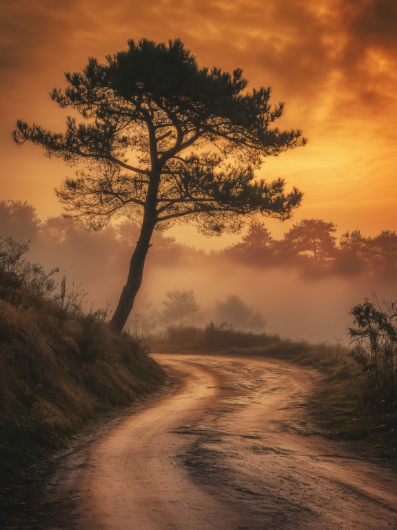 Dit kunstwerk toont een sfeervol en warm landschap met een slingerende weg die zich een weg baant door een mistige omgeving. Een majestueuze boom staat prominent in beeld, zijn silhouet scherp afgetekend tegen de prachtige gouden lucht van een zonsopkomst. De warme aardetinten en het zachte licht creƫren een rustgevende en dromerige sfeer. Dit beeld roept gevoelens van sereniteit en avontuur op, alsof het uitnodigt om de weg te volgen en de mysteries van de ochtend te ontdekken.