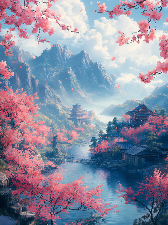 Peaceful Valley toont een betoverend Aziatisch landschap waarin een serene rivier zich slingert door een vallei vol roze kersenbloesems. De traditionele tempels en paviljoens nestelen zich harmonieus tussen de bloeiende bomen, terwijl majestueuze bergen zich verheffin in de mistige verte. De zachte pastelkleuren en de dromerige atmosfeer creëren een gevoel van pure tranquilliteit en spirituele rust. Dit poëtische kunstwerk brengt de tijdloze schoonheid van de Oosterse natuur en architectuur in een perfect evenwicht van sereniteit en elegantie.