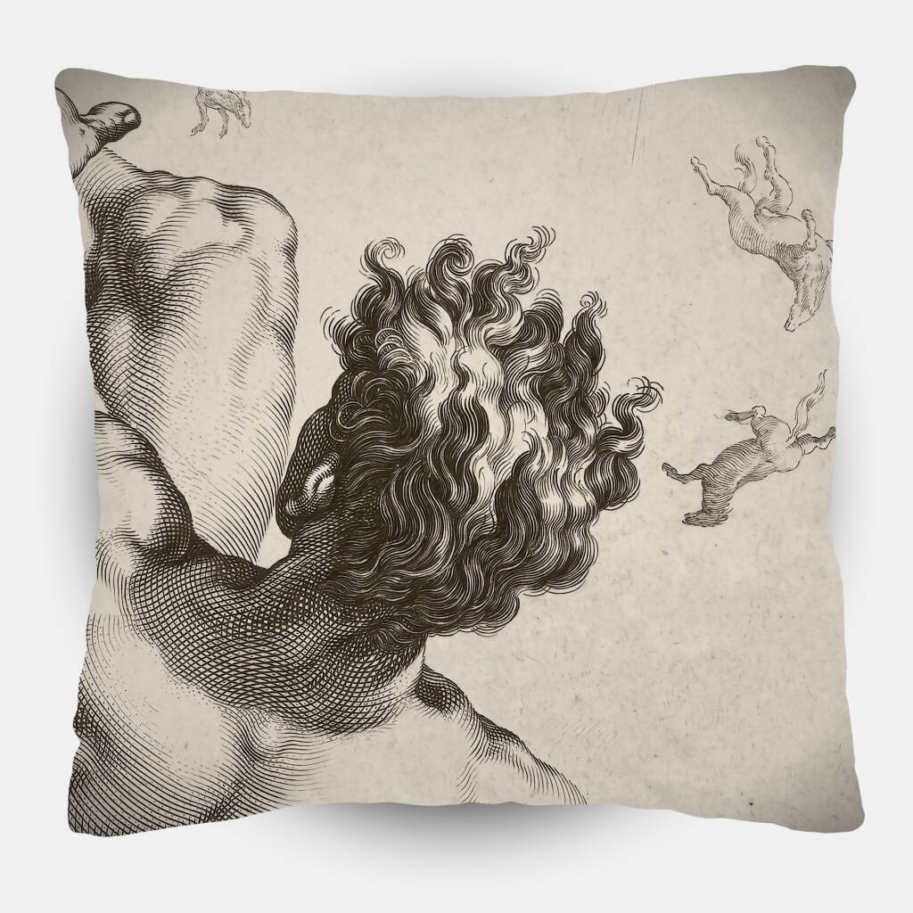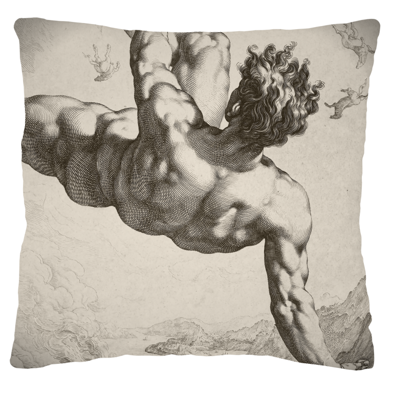 Een ronde compositie geïnspireerd door de klassieke mythologie. Het kunstwerk toont Phaëthon, naakt, die uit de hemel stort nadat hij de controle verloor over de zonnewagen van zijn vader, Helios. Achter hem zweven de wilde paarden en de wagen, terwijl een stralende zon het tafereel verlicht. Op de achtergrond zijn brandende gebouwen langs een baai zichtbaar, wat een dramatische sfeer creëert. Dit meesterwerk brengt een tijdloze mythe tot leven, ideaal voor liefhebbers van klassieke en symbolische kunst.
