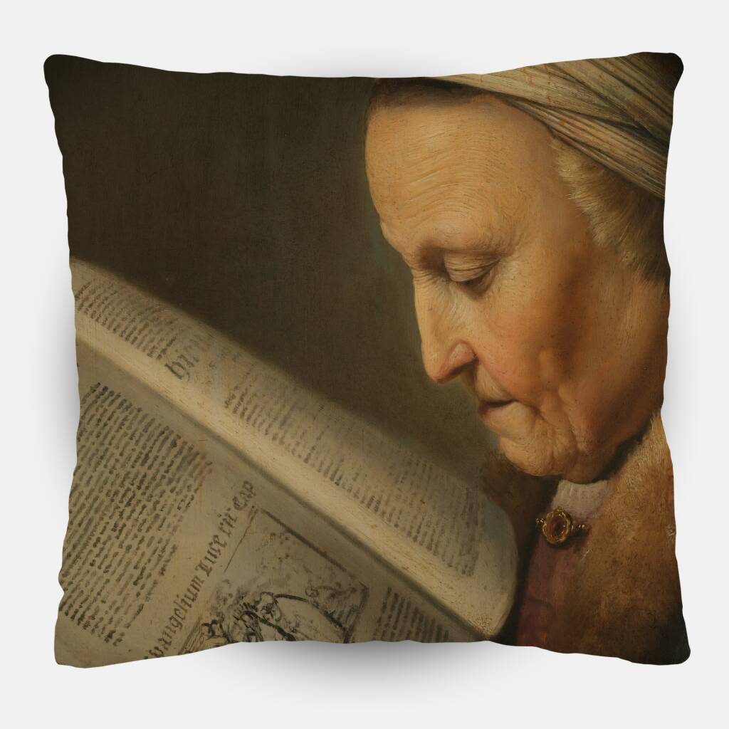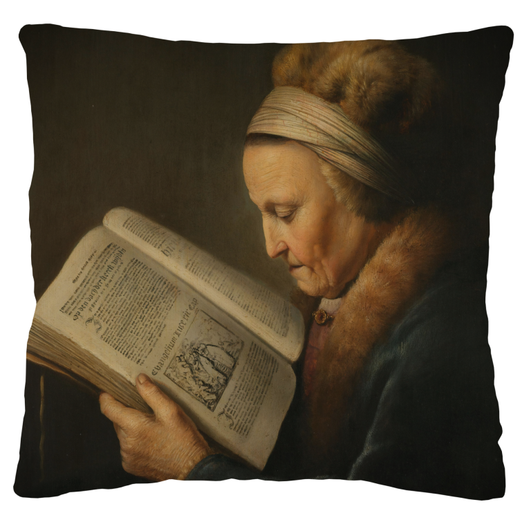 Lezende oude Vrouw is een intiem portret dat de tijdloze schoonheid van kennis en contemplatie viert. Een oudere vrouw, gehuld in warme bontkraag, is verdiept in haar boek, waarbij het zachte licht haar geconcentreerde gezicht verlicht tegen de donkere achtergrond. De meesterlijke lichtval benadrukt de textuur van haar kleding, de paginas van het boek en de lijnen van wijsheid in haar gezicht. Dit werk uit de Gouden Eeuw toont de waardigheid van het alledaagse leven en het belang van geletterdheid, zelfs voor vrouwen in een tijd waarin dit niet vanzelfsprekend was. Het schilderij straalt een diepe rust en concentratie uit, een moment van stille reflectie gevangen in tijd. Een tijdloos meesterwerk dat de universele menselijke dorst naar kennis en begrip portretteert.