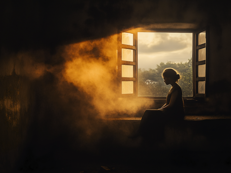 Early Rise vangt het magische moment van de vroege ochtend waarbij zonnestralen door een open raam naar binnen stromen en een vrouw in silhouet hullen. Het warme, gouden licht creëert een atmosferische nevel die de hele scène in een dromerige gloed zet, terwijl de rustige houding van de figuur een gevoel van vredelievende contemplatie uitstraalt. De contrasten tussen licht en schaduw, tussen binnen en buiten, vertellen een verhaal van nieuwe mogelijkheden. Dit intiems kunstwerk brengt de rust van de vroege morgen direct in je interieur.