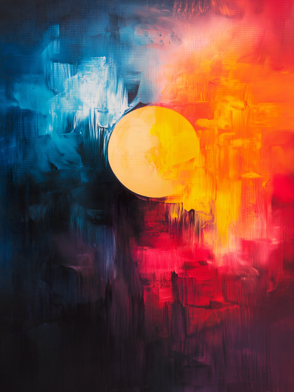 Two Sided presenteert een explosieve abstracte compositie waarin koele blauwe tinten botsen met warme oranje en rode kleuren, verenigd door een centraal geplaatste cirkel. De dynamische penseelstreken en druipende verf creƫren een gevoel van beweging en emotionele spanning tussen tegengestelden. Dit krachtige kunstwerk symboliseert dualiteit, balans en de complexiteit van het leven. Perfect voor liefhebbers van moderne abstracte kunst die ruimte willen geven aan interpretatie en emotie.