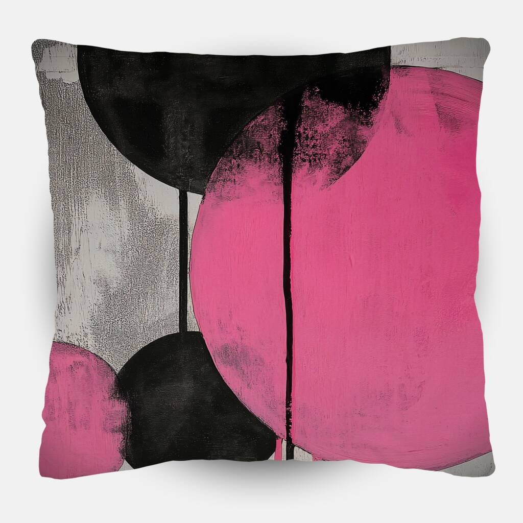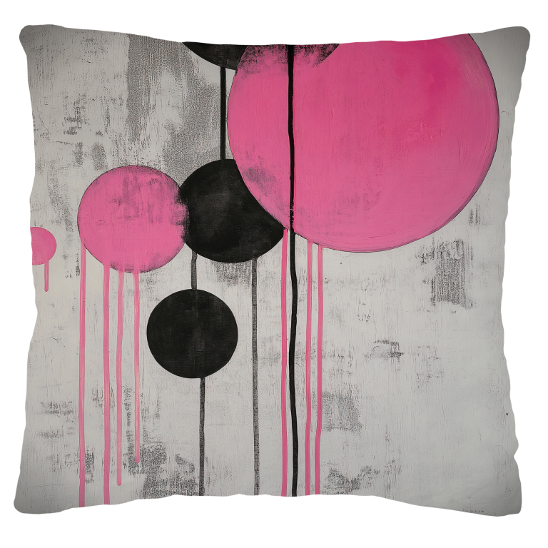 Een abstracte compositie waarin zwarte en roze cirkels tegen een ruwe, witachtige achtergrond zijn geplaatst. De roze cirkels stralen energie uit, terwijl de zwarte een gevoel van balans brengen. Druppels verf stromen omlaag vanaf sommige cirkels, wat het werk een dynamische, bijna onvoltooide kwaliteit geeft. Het contrast tussen de vloeiende verfstreken en de strak omlijnde vormen versterkt de impact van het ontwerp. Dit kunstwerk straalt moderniteit uit en biedt ruimte voor diverse interpretaties.