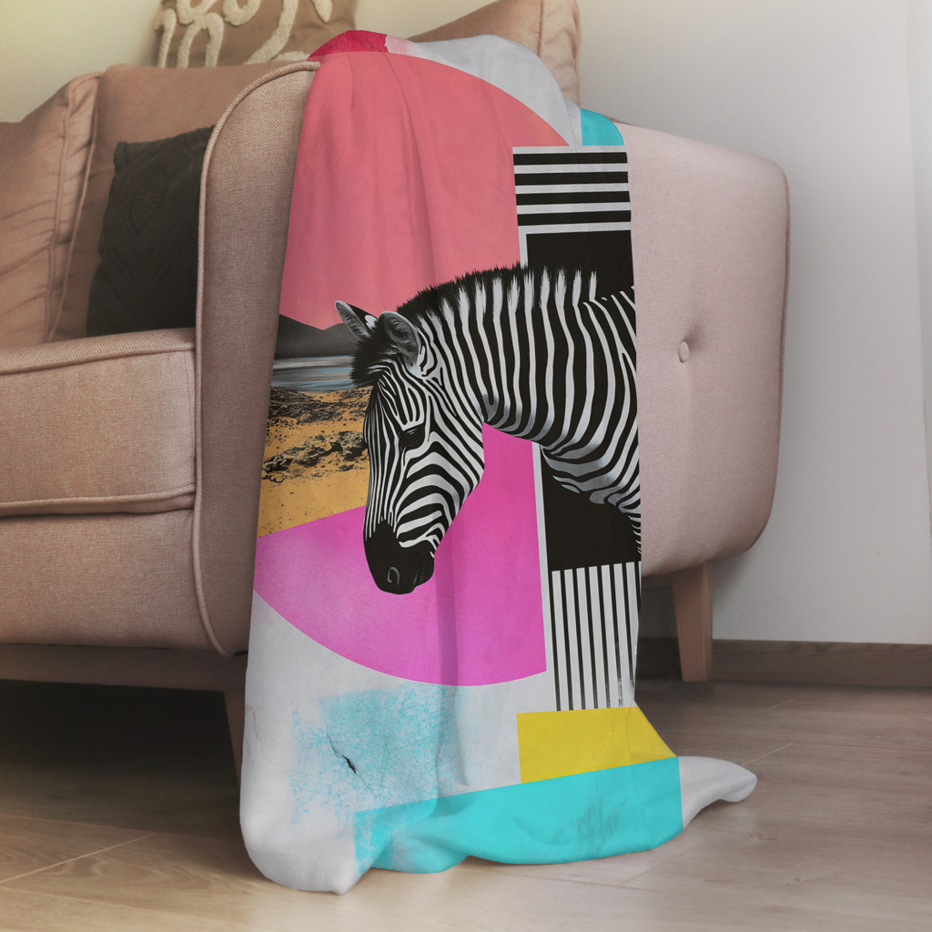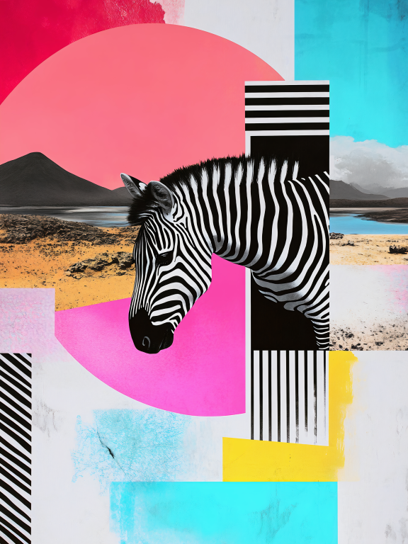 Zebra Collage combineert de natuurlijke schoonheid van een zebra met een levendige abstracte compositie van geometrische vormen en felle kleuren. Het realistische dier wordt omgeven door roze cirkels, turquoise blokken en contrasterende zwart-wit strepen die echoën de natuurlijke patronen van de zebra. De surrealistische landschapsachtergrond met bergen en gouden tinten wordt doorbroken door moderne grafische elementen. Dit contemporary kunstwerk brengt pop art esthetiek samen met natuurfotografie in een unieke en opvallende visuele ervaring.