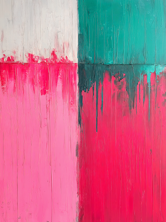 Pink and Teal Planes is een levendige verkenning van kleur en textuur in abstracte vorm. Krachtige vlakken van fuchsia en turquoise botsen en versmelten, waarbij de verfstreken de energie van het creatieproces verraden. De ruwe, expressieve penseelvoering geeft het werk een tactiele kwaliteit die uitnodigt tot nadere beschouwing. Druppels en vegen verf creëren organische verbindingen tussen de geometrische kleurvlakken, als een spontane conversatie tussen contrast en harmonie. Dit werk straalt een ongetemde vitaliteit uit die doet denken aan de vrijheid van het abstract expressionisme. De combinatie van warme roze tinten met koele turquoise creëert een visuele spanning die zowel opwindend als uitgebalanceerd aanvoelt. Een moedig statement voor de moderne kunstliefhebber.