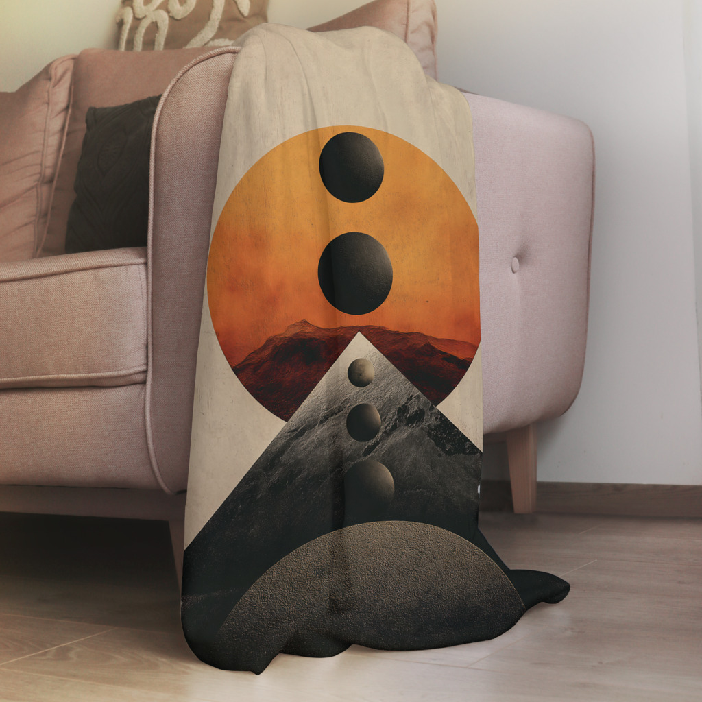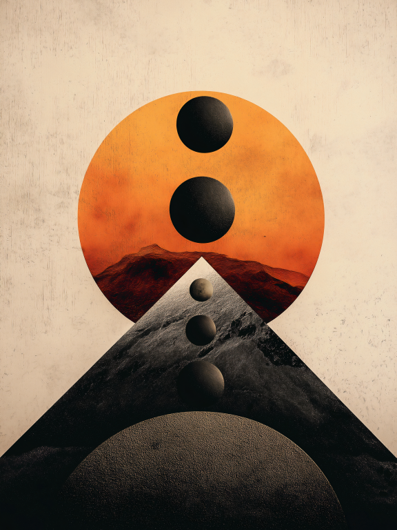 Een abstract kunstwerk met een harmonieuze compositie van geometrische vormen en natuurlijke elementen. Het beeld toont een grote oranje zon met donkere cirkels die in perfecte lijn zijn uitgelijnd boven een gelaagde bergachtige structuur. De combinatie van warme en aardse tinten, samen met de symmetrische compositie, creƫert een gevoel van balans en mystiek. Het kunstwerk straalt rust en evenwicht uit, terwijl het ook een surrealistische, bijna kosmische dimensie oproept. Perfect voor een moderne en minimalistische interieurstijl.