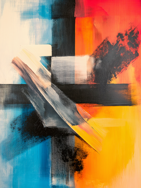 Asterix, is een abstract schilderij met dynamische en krachtige penseelstreken. De compositie bestaat uit een combinatie van geometrische en expressieve elementen, met opvallende contrasten tussen warme en koele kleuren. Blauwtinten aan de linkerkant vloeien samen met vurige rood-, oranje- en geeltinten aan de rechterkant, waardoor een energiek en gebalanceerd beeld ontstaat. De zwarte en witte accenten versterken de structuur en geven een gevoel van beweging en kracht. Het kunstwerk straalt een moderne en dynamische sfeer uit, ideaal voor een eigentijdse inrichting.