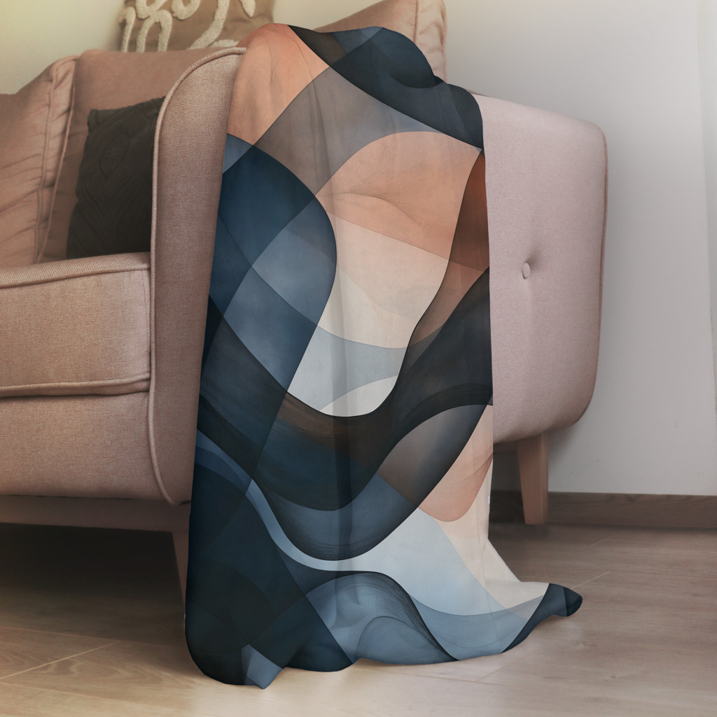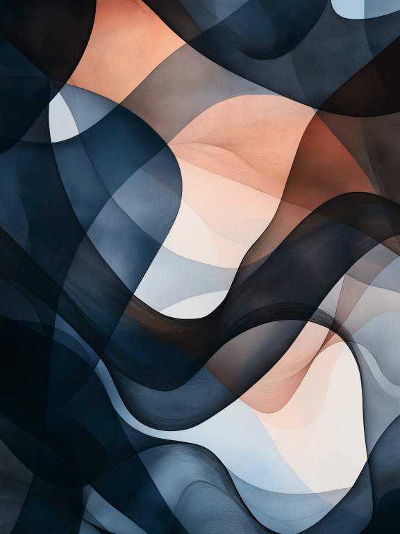 Interconnected Shapes presenteert een harmonieuze dans van verweven vormen in een verfijnd kleurenpalet. Vloeiende banden in middernachtblauw, zacht terracotta en poederroze weven door elkaar, creëren een driedimensionaal effect dat diepte en beweging suggereert. De overlappende transparante lagen onthullen subtiele kleurvariaties waar de vormen elkaar ontmoeten, als een visuele symfonie van verbondenheid. Dit abstracte werk verkent concepten van eenheid en individualiteit, waarbij elke vorm zijn eigen identiteit behoudt terwijl het deel uitmaakt van een groter geheel. De zachte gradiënten en organische lijnen roepen een gevoel op van rust en continuïteit. Een eigentijds kunstwerk dat de schoonheid van complexe relaties en onderlinge verbondenheid viert.