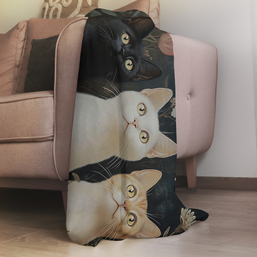 Drie katten in een artistieke, dromerige setting. De zwarte, witte en rood-witte kat zitten naast elkaar met grote, nieuwsgierige ogen, alsof ze iets fascinerends waarnemen. De achtergrond bestaat uit donkere tinten met delicate bloemen en planten, wat een elegante en mysterieuze sfeer creƫert. De warme kleuren van de bloemen en vacht contrasteren mooi met de donkere achtergrond, waardoor de compositie een harmonieuze balans krijgt. Dit kunstwerk straalt rust, verfijning en een vleugje speelsheid uit.