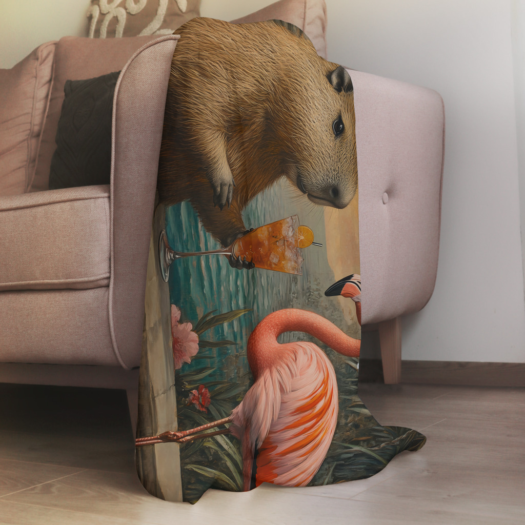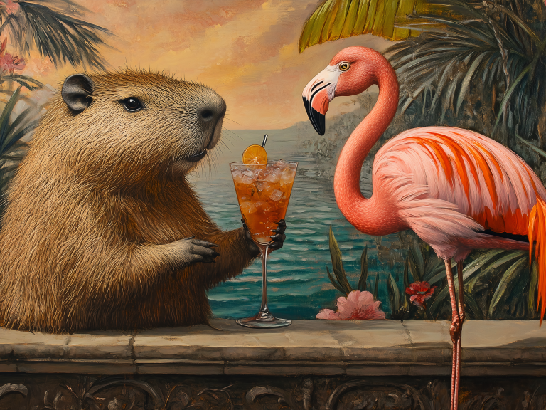 Your Drink, Madam presenteert een charmante ontmoeting tussen een galante capybara-barkeeper en een elegante flamingo-dame in een tropisch paradijs. De warme zonsondergangkleuren en luxueuze details van het terras creƫren een sfeer van verfijnde ontspanning en humor. Dit speelse kunstwerk combineert vintage glamour met dierlijke charme op een manier die zowel kinderen als volwassenen doet glimlachen. Perfect voor wie houdt van eigenzinnige kunst met een vleugje humor en exotische flair.