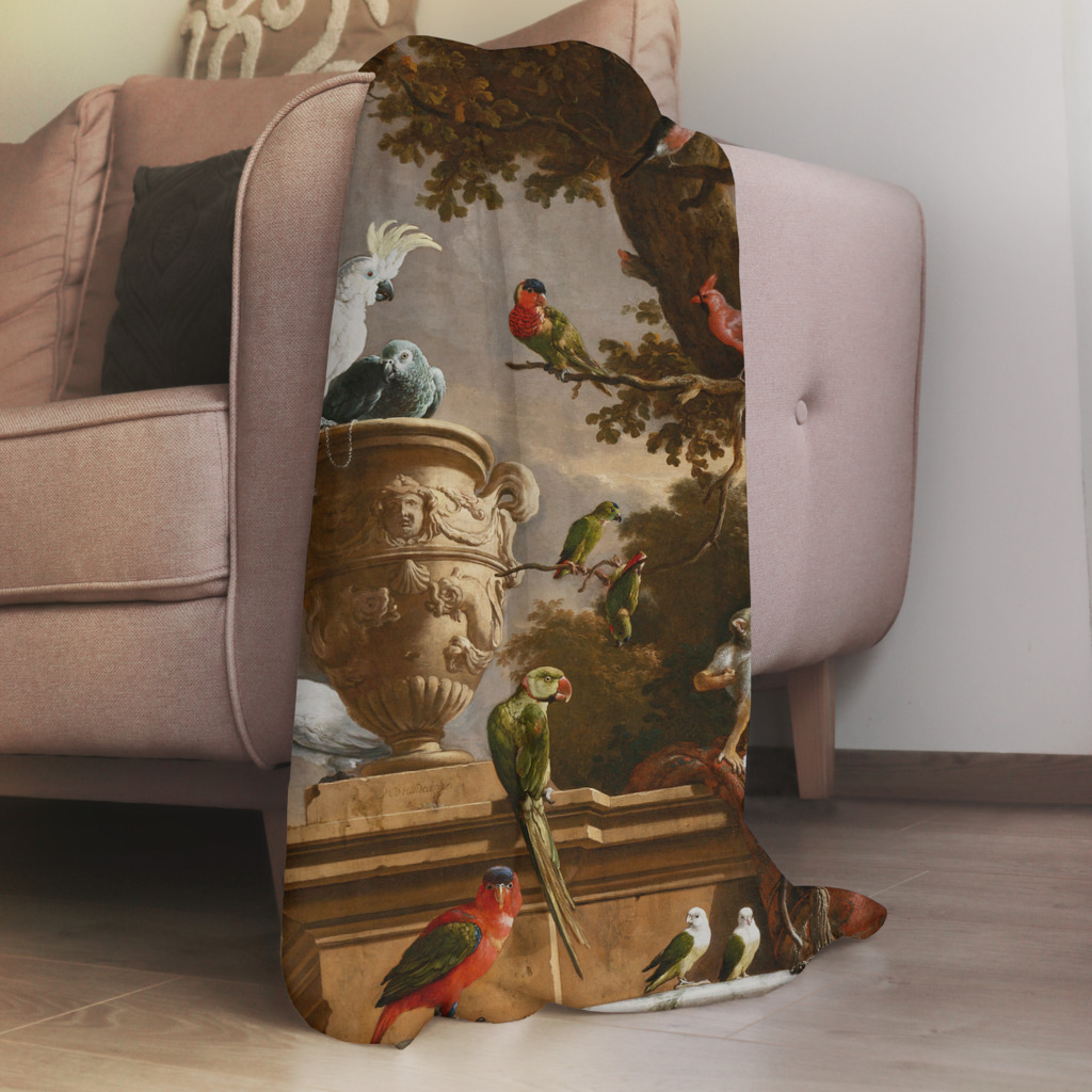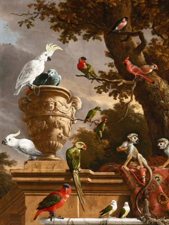 De Menagerie brengt een klassieke scène uit de Gouden Eeuw tot leven waarin een verzameling exotische dieren zich verzamelt rond een siertuin met monumentale architectuur. Kaketoes, apen, papegaaien en andere tropische dieren bevolken dit levendige tafereel, waarbij elke soort met een verbluffende aandacht voor detail is weergegeven. De warme aardtinten en de rijke texturen van het baroque landschap creëren een sfeer van verfijnde elegantie en klassieke grandeur. Dit meesterwerk toont de fascinatie van de oude meesters voor de exotische dierenwereld.