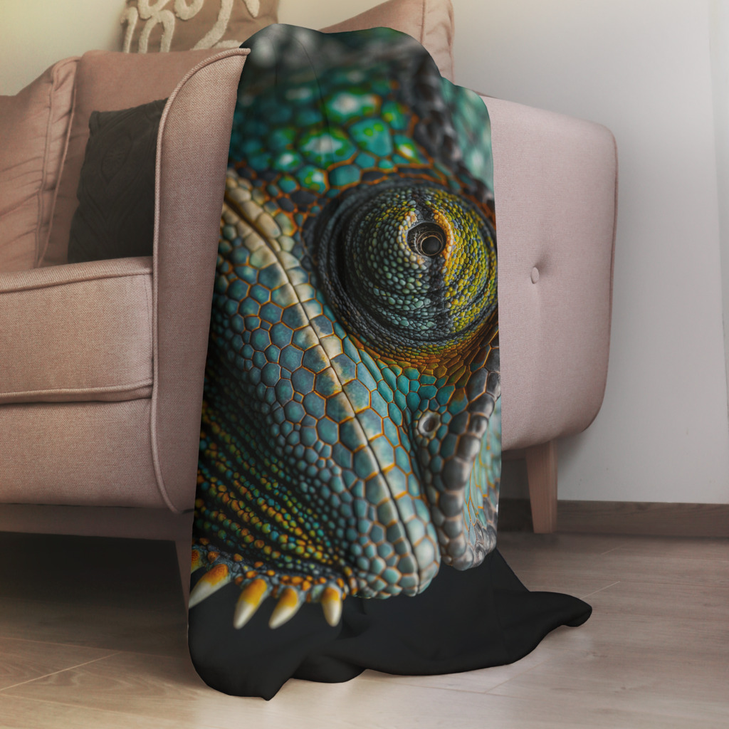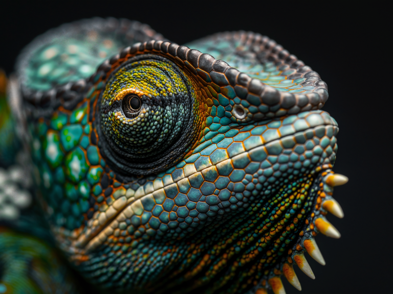 Karma Chameleon is een fascinerend portret van een kameleon, vastgelegd met een indrukwekkende scherpte en detail. De huid van de kameleon is bedekt met een mozaïek van turquoise, groene en oranje schubben, die samen een bijna buitenaards patroon vormen. De textuur is verbluffend, met subtiele kleurverlopen en een metallic glans die het reptiel een majestueuze uitstraling geeft. Het oog van de kameleon, met zijn complexe structuur en intense blik, trekt onmiddellijk de aandacht en geeft het beeld een mysterieuze, observerende sfeer. De donkere achtergrond benadrukt de levendige kleuren en maakt de details nog prominenter. Dit kunstwerk straalt exotische schoonheid, kracht en mysterie uit.
