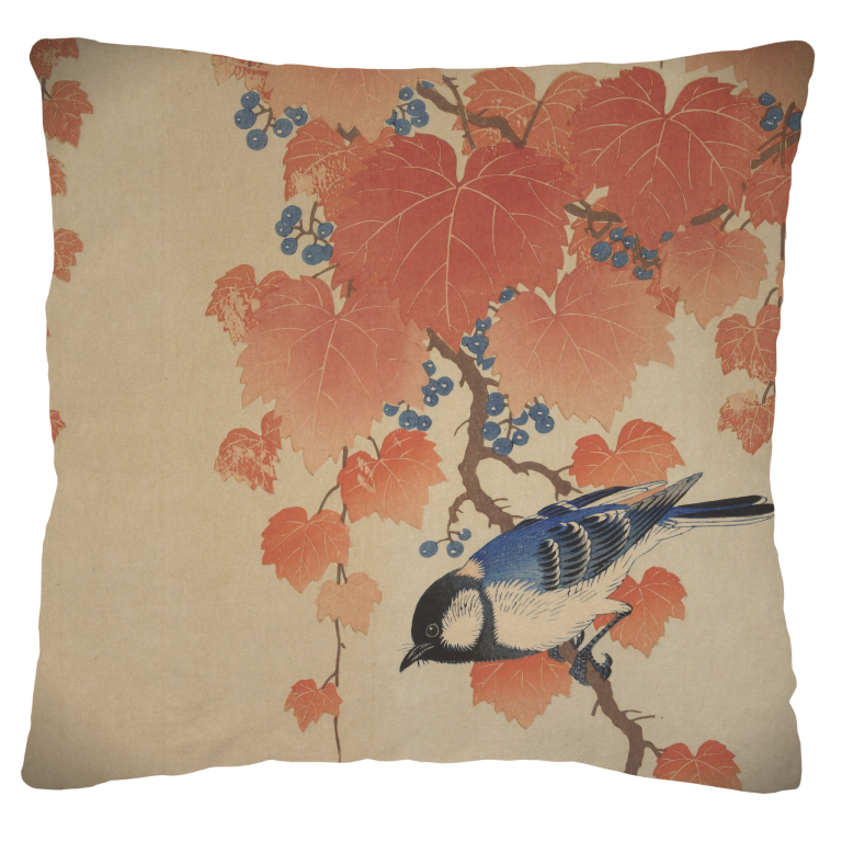 Koolmees op Paulownia Tak belichaamt de verfijnde schoonheid van de Japanse natuurkunst. Een levendige koolmees met zijn kenmerkende blauwe en witte verenkleed rust elegant op een sierlijke tak, omgeven door de warme herfsttinten van paulowniabladeren. De delicate blauwe bessen vormen een subtiel contrast met het terracottarood van het gebladerte, terwijl de zachte beige achtergrond de compositie een tijdloze sereniteit geeft. Dit kunstwerk vangt een vluchtig moment in de natuur met opmerkelijke precisie en gevoeligheid. De harmonische balans tussen de verschillende elementen - de dynamische vogel, de organische takken en het decoratieve gebladerte - creëert een visuele symfonie die zowel rust als levendigheid uitstraalt. Een klassiek voorbeeld van hoe natuurobservatie tot verheven kunst kan leiden.
