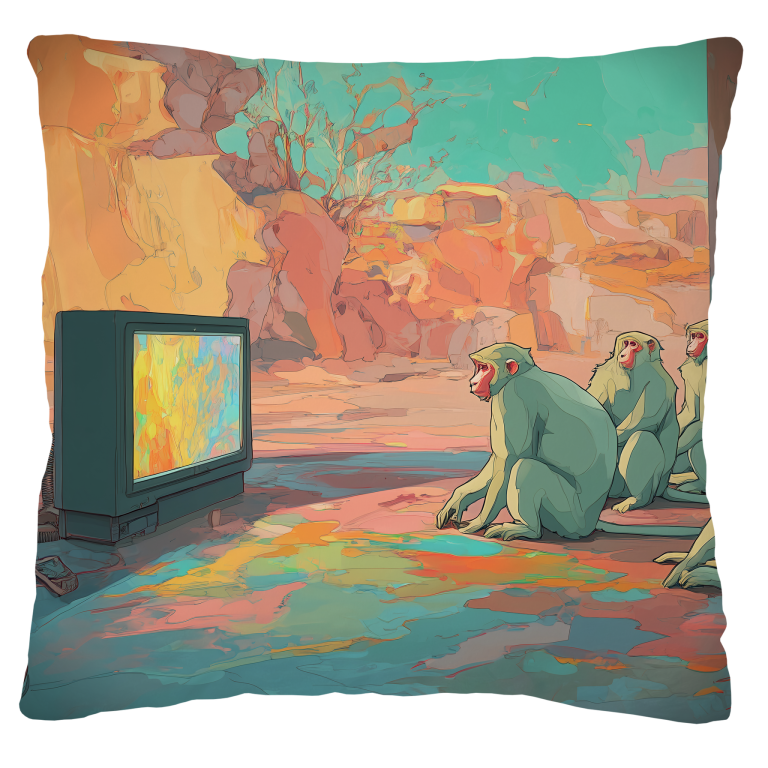 Dystopian Future presenteert een humoristische kijk op de toekomst waarin een groep apen gefascineerd televisie kijkt in een vervallen woestijnlandschap. De contrast tussen de moderne technologie en de primitieve setting creëert een satirische commentaar op de evolutie en onze afhankelijkheid van media. De warme oranje en turquoise kleuren geven de post-apocalyptische scène een surreële, dromerige kwaliteit. Dit thought-provoking kunstwerk combineert humor met sociale kritiek en brengt een unieke gespreksopener in elke ruimte.