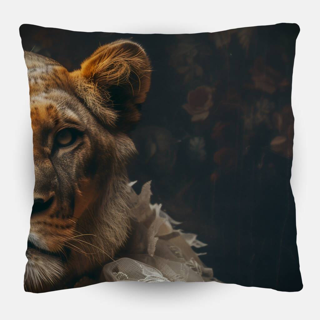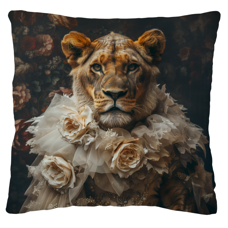 Wife of the Jungle is een indrukwekkend portret waarin de kracht en elegantie van een leeuwin worden gecombineerd met de verfijning van klassieke mode. De leeuwin draagt een weelderige jurk versierd met delicate parels, kant en volumineuze bloemen, wat haar een koninklijke uitstraling geeft. De achtergrond met donkere, bloemrijke patronen versterkt het gevoel van tijdloze luxe. Haar doordringende blik en zelfverzekerde houding maken het portret tot een krachtige samensmelting van wilde schoonheid en aristocratische grandeur, waarbij de natuurlijke majesteit van de jungle samenkomt met menselijke verfijning.