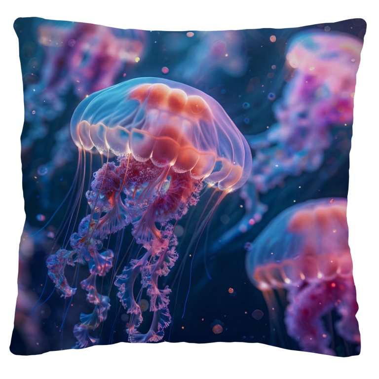 Moon Jellyfish is een betoverend tafereel dat de serene elegantie van deze zachte zeebewoners vangt. De kwallen zweven gewichtloos door het diepe blauw van de oceaan, hun doorschijnende, koepelvormige lichamen gloeien zachtjes in tinten van lila, roze en lichtblauw. Hun delicate tentakels dansen sierlijk mee met de stroming, als zwevende linten die fonkelen in het gefilterde licht. De achtergrond vervaagt in een dromerige waas van bubbels en waterdeeltjes, wat de illusie wekt van een oneindige, mysterieuze onderwaterwereld. De compositie straalt rust en verwondering uit, alsof je zelf door de diepten zweeft tussen deze magische wezens.