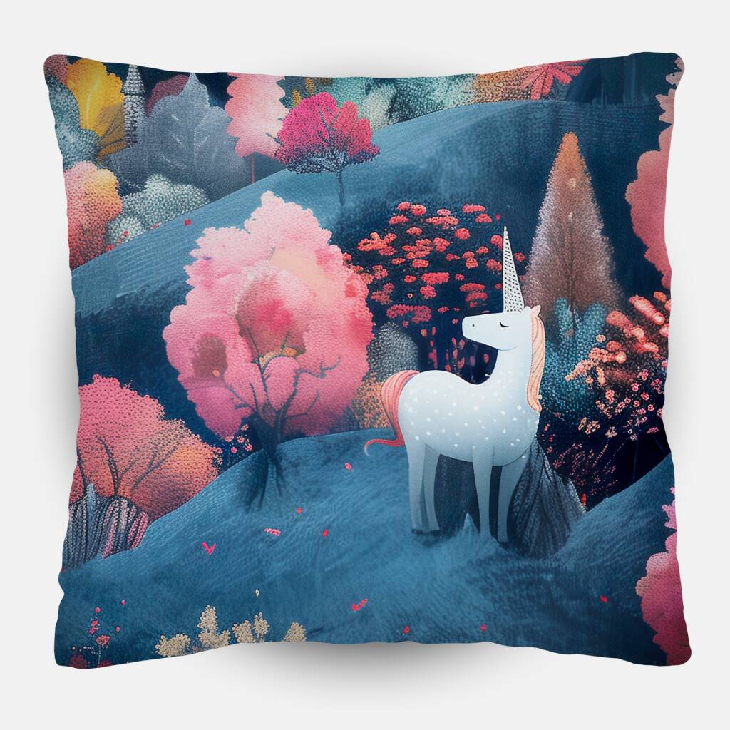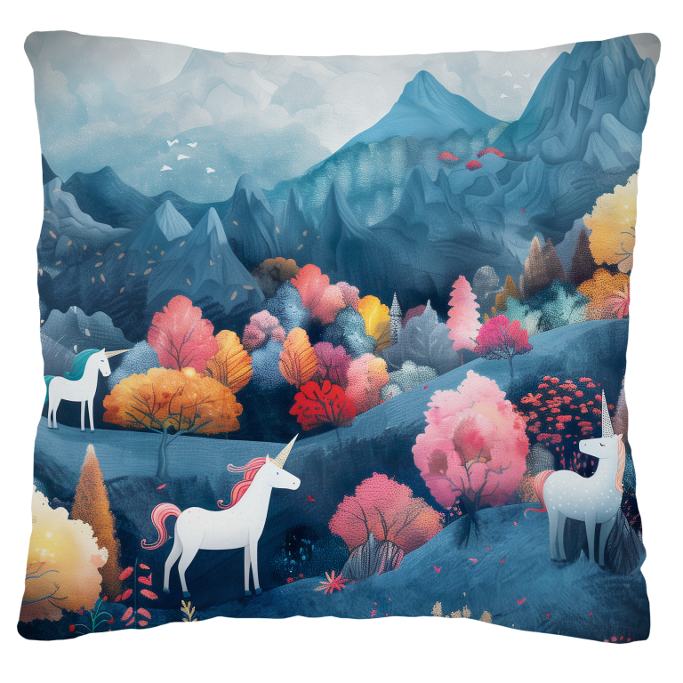 Unicorn Paradise is een betoverend tafereel dat je meeneemt naar een sprookjesachtige wereld, verborgen in de rustige heuvels van een mystiek landschap. De lucht is zacht en dromerig, met bergen die in de verte oprijzen en gehuld zijn in een lichte, magische mist. De heuvels zijn versierd met bomen in warme tinten van roze, geel en rood, wat een prachtig contrast vormt met de koele blauwe ondergrond. Te midden van deze kleurrijke oase dwalen majestueuze witte eenhoorns rond, hun manen zachtjes golvend in pastelkleuren. Hun hoorns glinsteren subtiel in het licht, alsof ze zelf een bron van magie zijn. De hele scène straalt rust en verwondering uit, alsof je een verborgen paradijs hebt ontdekt waar alleen de puurste dromen tot leven komen.
