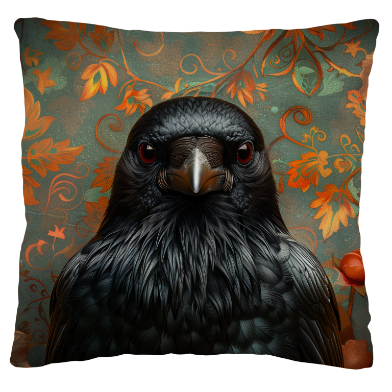 Paranoid Crow is een intrigerend en licht mysterieus kunstwerk dat de sfeer van een gotisch sprookje oproept. In het midden staat een zwarte kraai met doordringende, wantrouwige ogen die je strak aankijken - alsof hij elk moment een verdacht geluid heeft gehoord. Zijn glanzende veren tonen subtiele schakeringen van blauw en grijs, perfect uitgelicht tegen een rijkelijk versierde achtergrond van oranje bloemen en sierlijke bladeren op een blauwgroene ondergrond. Het contrast tussen de duistere vogel en de warme, weelderige florale achtergrond geeft het werk zowel elegantie als spanning.