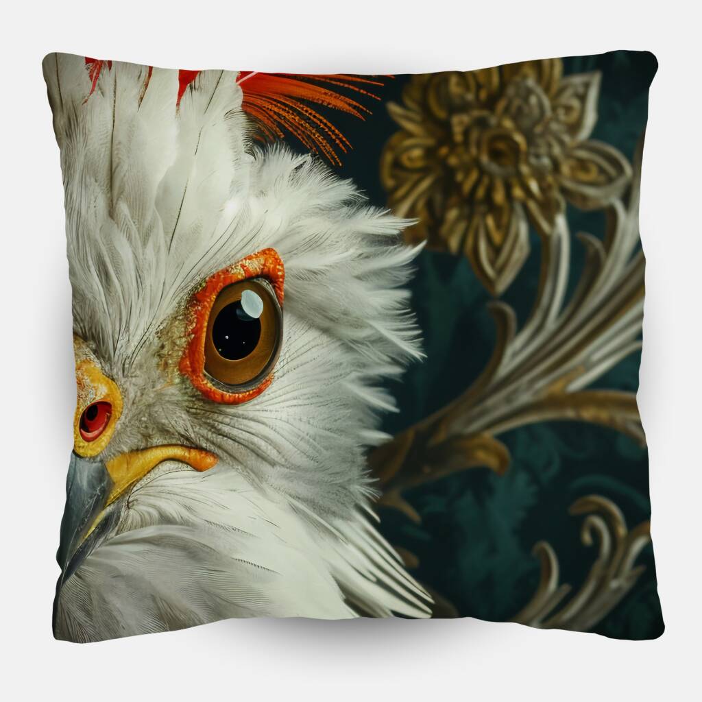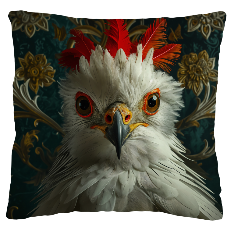 Helpful Secretary is een verrassend statig en charmant portret van een secretarisvogel met een alerte, dienstbare blik. De vogel kijkt je recht aan met grote, oplettende ogen, alsof hij klaarstaat om notities te maken of een taak op zich te nemen. Zijn opvallende rode kuif steekt scherp af tegen zijn witte en grijze verenkleed, terwijl de rijk gedetailleerde achtergrond met barokke patronen in goud en groen een gevoel van elegantie toevoegt. Deze komische en stijlvolle compositie speelt op een speelse manier met het idee van een toegewijde assistent in vogelvorm.