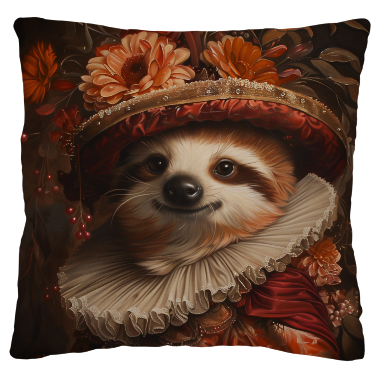 Het schilderij toont een schattige luiaard in een rijkelijk versierde, historische outfit. De luiaard draagt een prachtig barokke jurk in warme tinten rood en goud, met gedetailleerde patronen en sierlijke plooien. Een opvallende brede kraag en een elegante hoed, versierd met bloemen, maken de koninklijke uitstraling compleet. De achtergrond is gevuld met donkere, warme tinten en florale elementen, wat het schilderij een klassieke, bijna aristocratische sfeer geeft. De combinatie van het dier en de luxe kleding zorgt voor een speelse, bijna sprookjesachtige uitstraling.