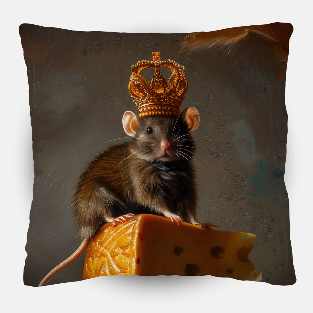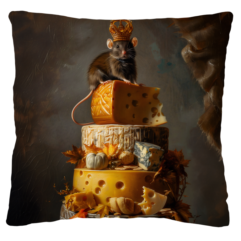 King of Cheese toont een charmante muis die trots een gouden kroon draagt terwijl hij de baas speelt over een indrukwekkende toren van verschillende kaassoorten. Van brie tot cheddar, van geitenkaas tot blauwe kaas, elke variëteit is met verbluffende precisie weergegeven in dit humoristische stilleven. De warme belichting en de rijke texturen geven elke kaas een verleidelijke glans, terwijl de kleine koning met koninklijke waardigheid over zijn culinaire koninkrijk waakt. Dit speelse kunstwerk combineert humor met oog voor detail en brengt een glimlach in elke keuken of eetkamer.