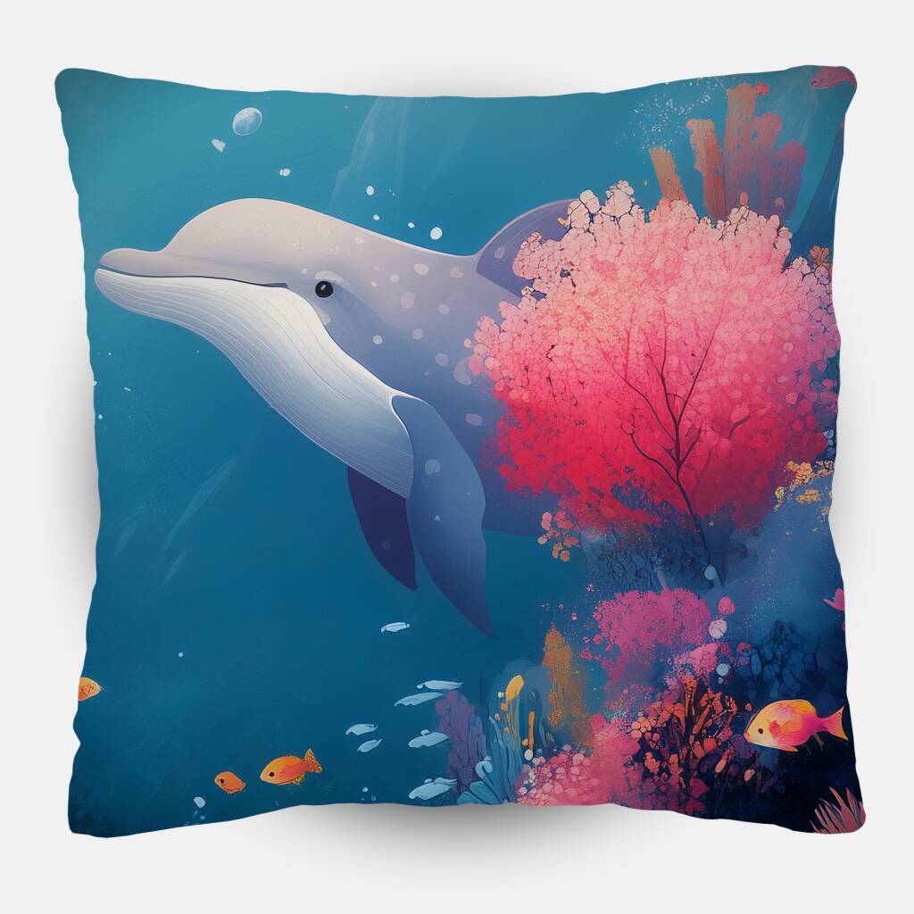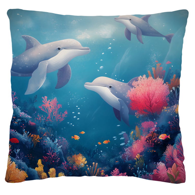 In dit betoverende onderwaterlandschap zweven drie speelse dolfijnen sierlijk door een levendig koraalrif. Omringd door een explosie van kleuren – met tinten roze, oranje, geel en blauw – straalt de scène een gevoel van rust en magie uit. Het kristalheldere water, gevuld met kleine luchtbelletjes en nieuwsgierige tropische vissen, nodigt de kijker uit om zich onder te dompelen in deze serene en dromerige oceaanwereld. De zachte gloed van het zonlicht dat door het water filtert, geeft de afbeelding een sprookjesachtige sfeer. Dit kunstwerk vangt niet alleen de schoonheid van de zee, maar ook de speelse en intelligente aard van dolfijnen, waardoor het een ware blikvanger is in iedere ruimte.