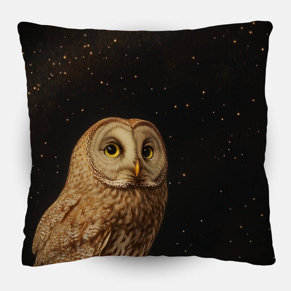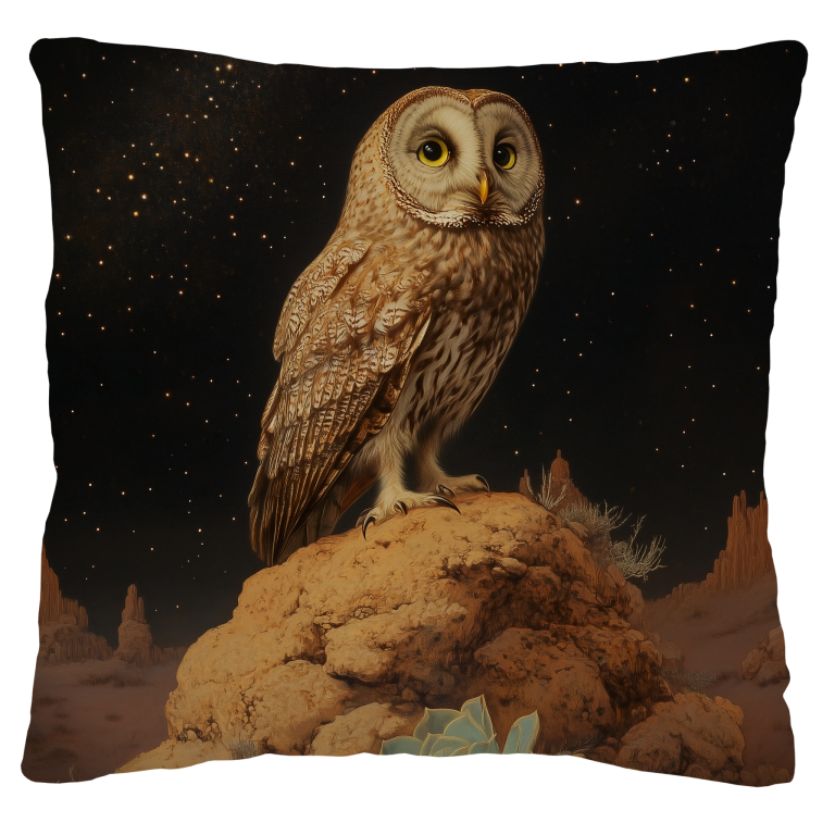 Night Owl toont een wijze uil die waakt over een mystiek woestijnlandschap onder een sterrenrijke hemel. De majestueuze vogel zit trots op een rotsformatie omgeven door delicate succulenten, terwijl duizenden sterren fonkelen in de diepe nachtelijke hemel. De warme aardetinten van de woestijnbodem contrasteren prachtig met de koele tinten van de nacht, wat een gevoel van serene contemplatie creëert. Dit betoverende kunstwerk brengt de mystiek van de nacht en de wijsheid van de natuur samen in een tijdloze compositie.