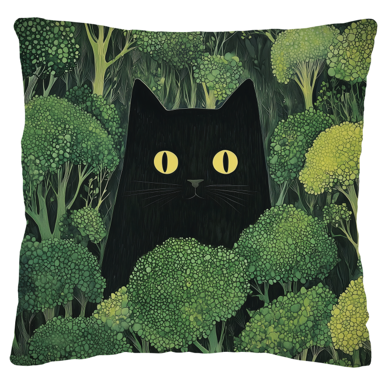 Een mysterieus tafereel waarin een zwarte kat met felle, doordringende gele ogen subtiel verscholen zit tussen een weelderig bos van broccolistruiken. De contrasterende kleuren – het diepe zwart van de kat en het levendige groen van de broccoli – trekken direct de aandacht en geven het werk een speelse, surrealistische sfeer. De kat lijkt zowel nieuwsgierig als ongrijpbaar, wat een gevoel van humor en intrige toevoegt. Het geheel straalt een delicate balans tussen natuur en fantasie uit.