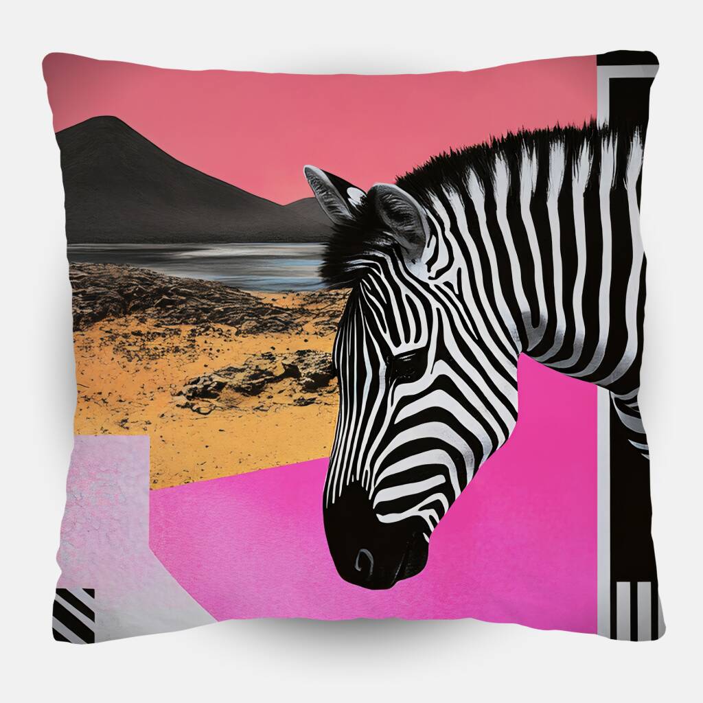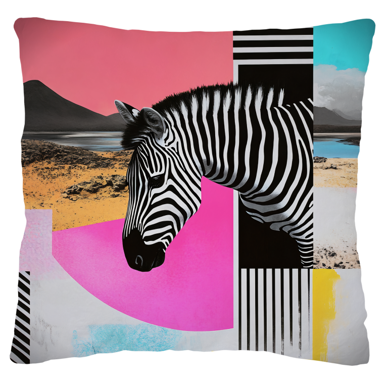 Zebra Collage combineert de natuurlijke schoonheid van een zebra met een levendige abstracte compositie van geometrische vormen en felle kleuren. Het realistische dier wordt omgeven door roze cirkels, turquoise blokken en contrasterende zwart-wit strepen die echoën de natuurlijke patronen van de zebra. De surrealistische landschapsachtergrond met bergen en gouden tinten wordt doorbroken door moderne grafische elementen. Dit contemporary kunstwerk brengt pop art esthetiek samen met natuurfotografie in een unieke en opvallende visuele ervaring.